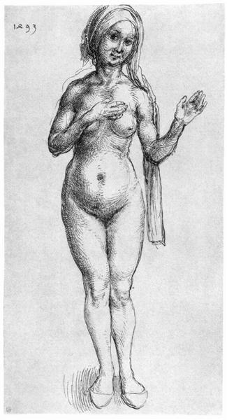 German painter Albrecht Dürer created this nude study in 1493, a pen and ink drawing in the Northern Renaissance style. The work reflects Dürer's interest in the human form at a time when such studies were common in Italy but rare in Germany. Finding models willing to pose nude proved difficult north of the Alps, a problem Dürer repeatedly complained about.