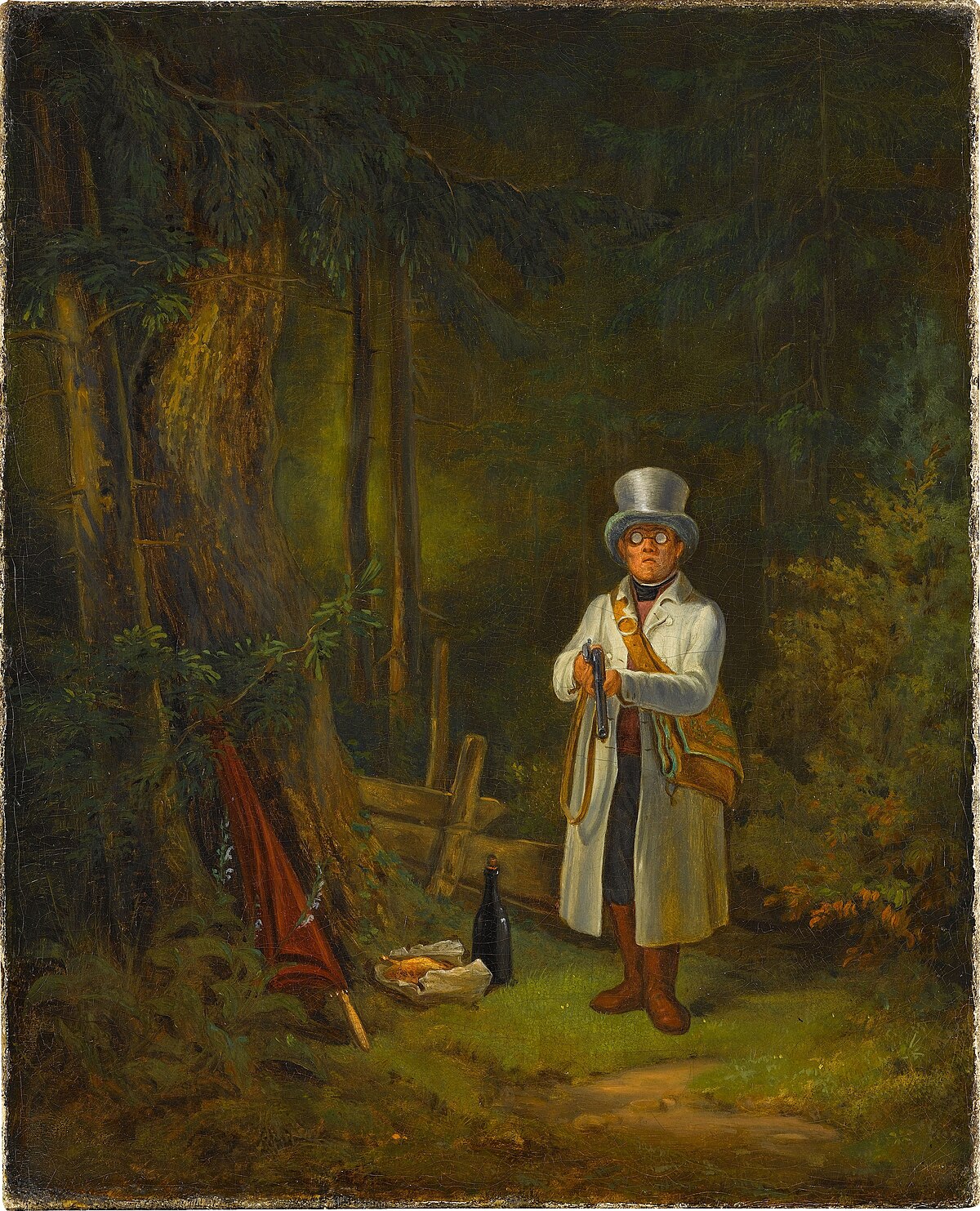 Spitzweg was a self-taught painter who worked as a pharmacist before dedicating himself to art in his thirties. His scenes often feature eccentric characters, daydreaming poets, and nostalgic landscapes that gently satirize the aspirations and foibles of bourgeois society. Unlike his famous Poor Poet painting, this work focuses on youthful romance rather than artistic poverty. The painting remains in a private collection, typical of his smaller, intimate cabinet pictures that were popular with middle-class German collectors.