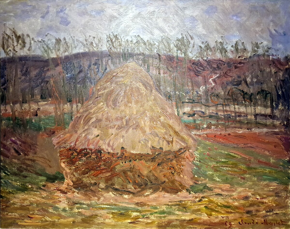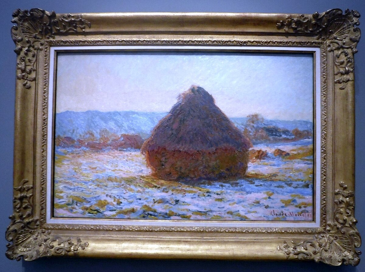 Claude Monet painted a grainstack on a snowy morning. The early light creates pink and blue tones across the snow. Morning scenes in the series have particularly delicate colors.