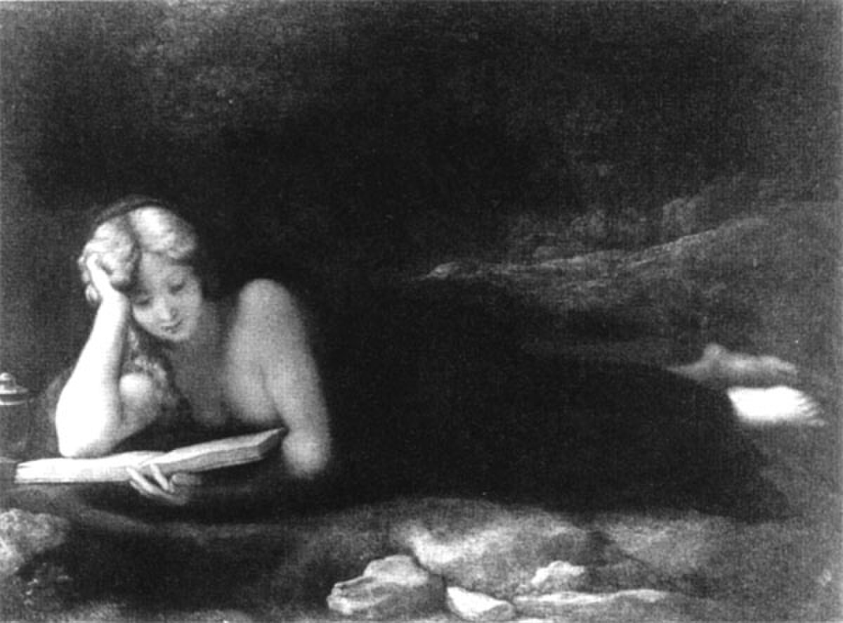 Correggio painted The Magdalene around 1518, showing Mary Magdalene in a moment of quiet contemplation. She reclines in a wooded setting, her head resting on her hand as she reads a devotional text. The soft, diffused lighting creates a sense of intimate devotion.