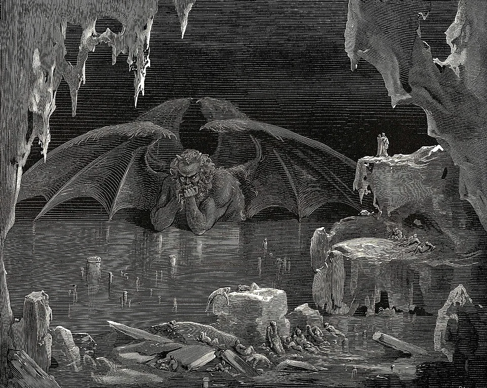 Working in oil on canvas, Gustave Doré painted this Dante and Virgil in the Ninth Circle of Hell around 1861, a dramatic interpretation of Dante Alighieri's Inferno. The ancient poet Virgil guides Dante through the frozen depths of Hell where traitors are imprisoned in ice. Doré brings his famous illustrations of the Divine Comedy to monumental painted form.