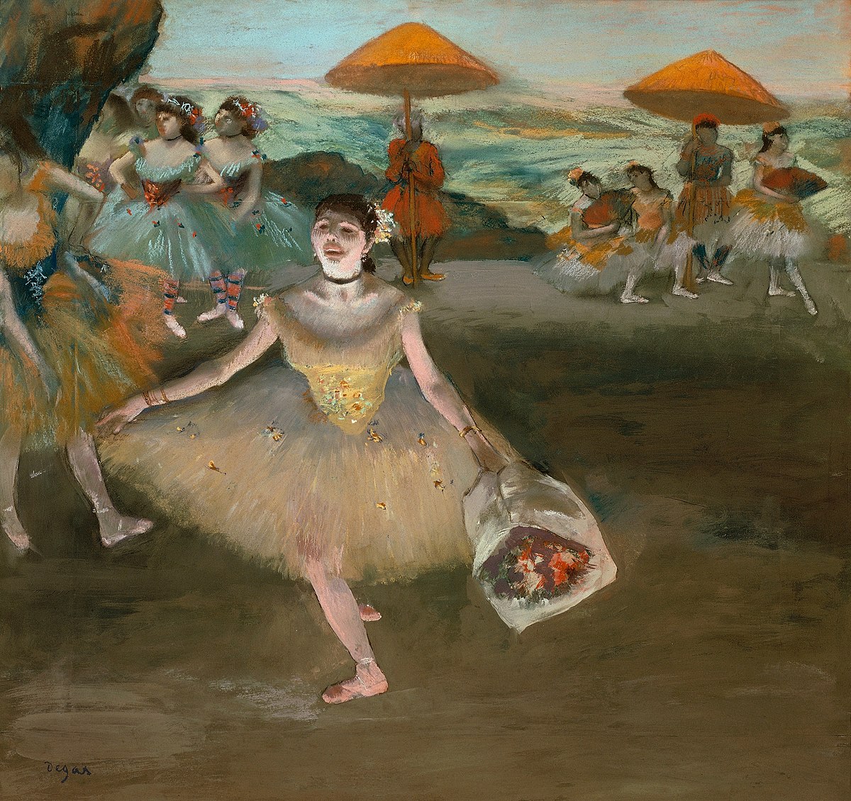 Edgar Degas captured a ballerina taking her bow in this graceful study. The dancer's curved posture and extended arms show the formal gesture of acknowledging applause. Degas observed countless rehearsals and performances at the Paris Opéra.