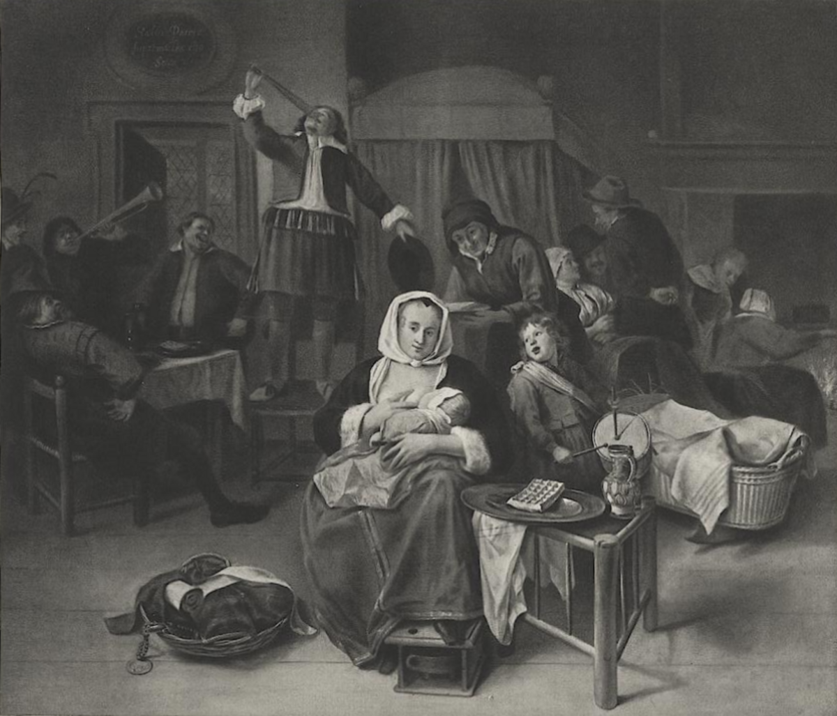 Jan Steen executed this lively tavern celebration during the 1660s-1670s, showing a company celebrating the birthday of Prince William III of Orange-Nassau (November 14, 1650). A portrait of the prince hangs above a bedstead while a copper crown with orange branch decorates the table.