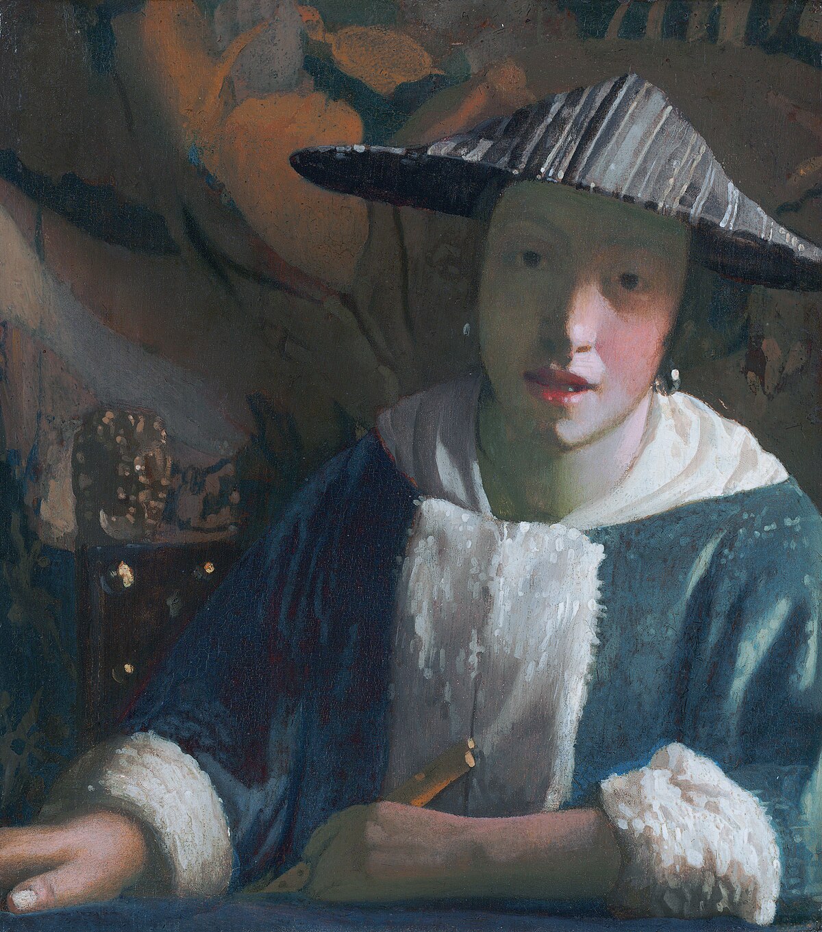Johannes Vermeer painted the Girl with a Flute around 1665. The small painting shows a young woman wearing a distinctive Chinese hat. Scholars debate whether Vermeer himself painted this work.