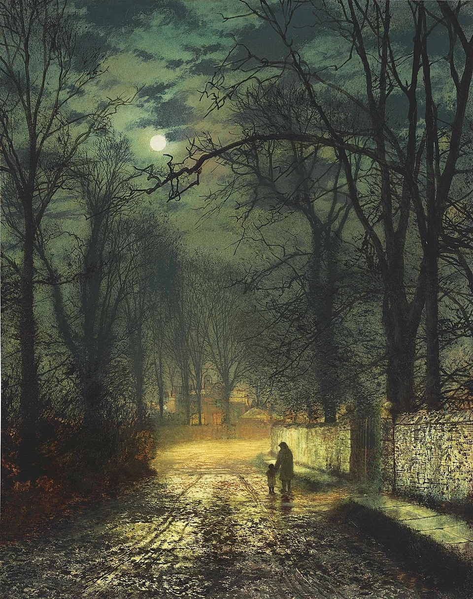 The omnibus receding down a perfectly straight street creates depth. Grimshaw specialized in such urban nocturnes, capturing the Romantic atmosphere of moonlit industrial cities. His friend James McNeill Whistler said, "I considered myself the inventor of nocturnes until I saw Grimmy's moonlight picture." Grimshaw concentrated on the interplay of artificial and natural light, fog and reflection. The work measures 61 x 91.4 cm, oil on canvas, and was purchased by Tate Britain in 1967.