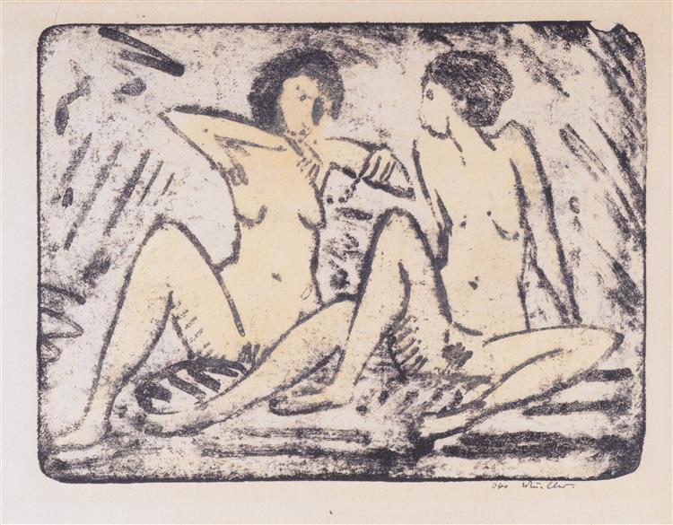 German painter Otto Mueller painted this scene of nude figures in nature around 1918-1920, showing two girls and a standing youth in a landscape setting. The work exemplifies Mueller's characteristic style: elongated forms, muted earth tones, and figures at ease in natural surroundings. His simplified shapes and matt surface give the painting a fresco-like quality.