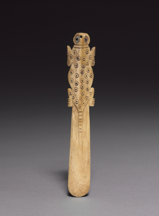 This sculpture, dating to 100 BCE–700 CE. Made from bone with shell inlay, it measures Overall: 11.8 x 2.6 cm (4 5/8 x 1 in.).