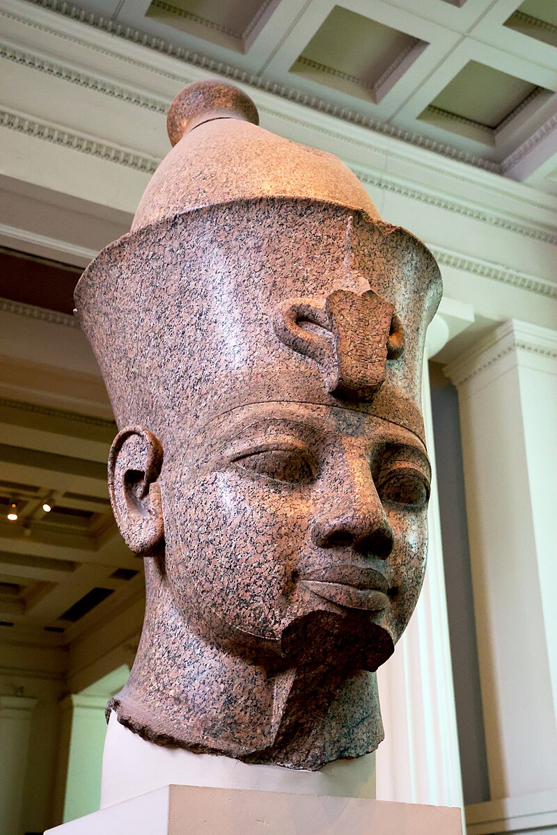 Ancient Egyptian This granite statue depicts Amenhotep III, one of ancient Egypt's most powerful pharaohs who ruled during the 18th Dynasty (c. 1390-1352 BCE). The king is shown seated in the traditional pose of Egyptian royalty, wearing the nemes headdress and false beard. The statue is displayed at the British Museum.
