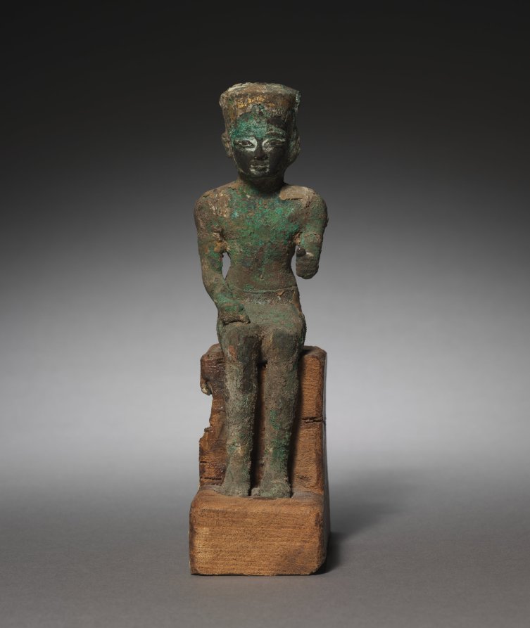 This Egyptian work, dating to 715–525 BCE. Made from bronze and black copper, gilded and inlaid, it measures Overall: 19 x 5.5 x 11.5 cm (7 1/2 x 2 3/16 x 4 1/2 in.).