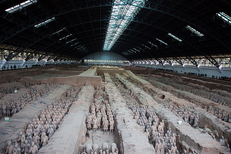 Farmers discovered the first fragments in 1974 while digging a well near Xi'an. Excavation revealed three major pits containing infantry, cavalry, archers, and officers arranged in battle formation. The warriors originally held real weapons (mostly looted in antiquity) and were painted in bright colors that faded within minutes of exposure to air. Some pigments have been preserved using modern techniques.