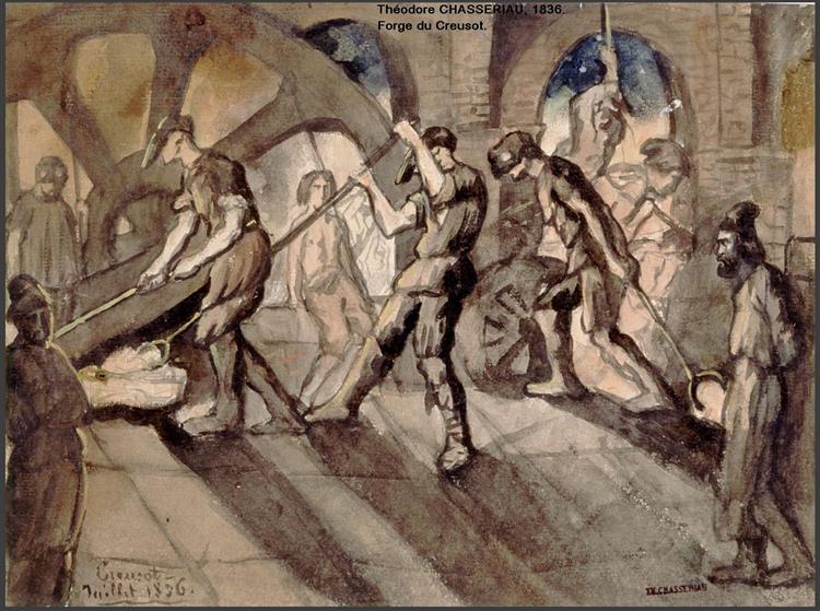 French artist Théodore Chassériau painted this industrial scene depicting the famous ironworks at Le Creusot. The composition captures the dramatic light of the forge with Romantic intensity applied to modern industry.
