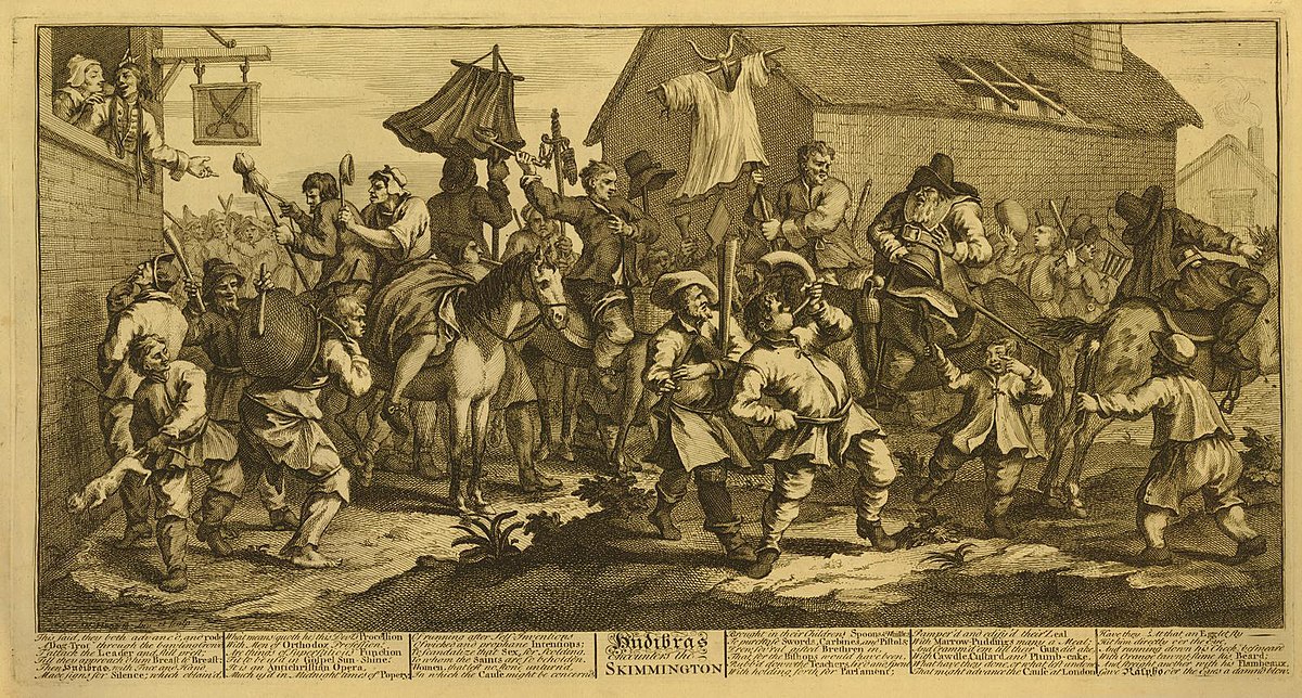British artist William Hogarth created this satirical scene around 1726, illustrating an episode from Samuel Butler's mock-heroic poem "Hudibras." The composition shows the bumbling knight encountering a "skimmington ride," a folk ritual used to shame couples who violated social norms. Hogarth's crowded composition captures the chaos and comedy of Butler's verse.