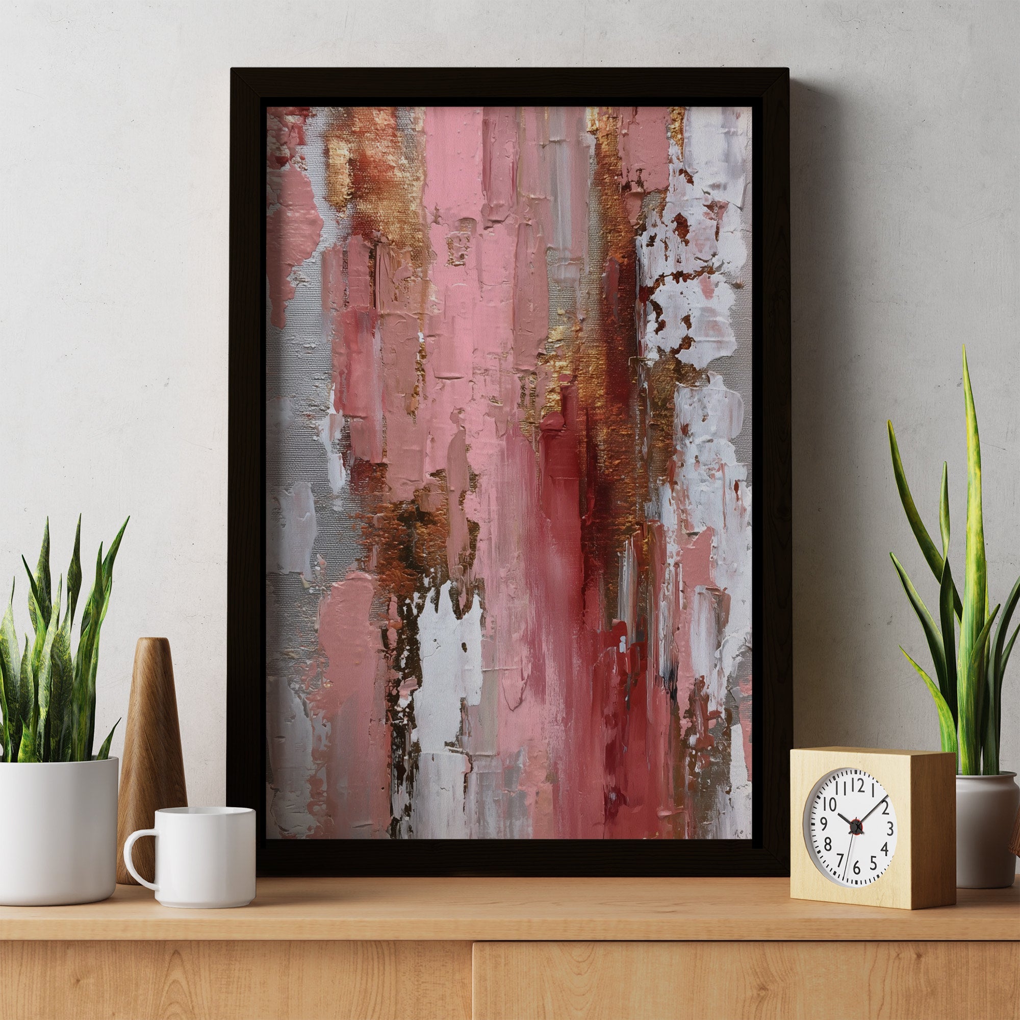 It's abstract without being cold. The warm pinks and metallics give it a softness that works in bedrooms, bathrooms, or living rooms with neutral or blush-toned decor. The kind of piece that adds warmth without competing for attention.