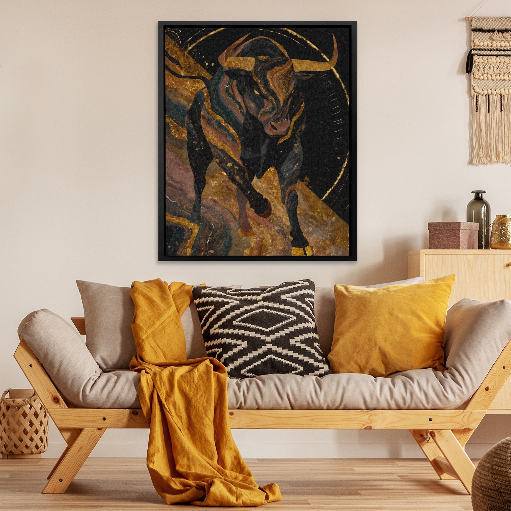 Bull in flowing liquid gold abstraction. A bold piece for any modern living room.