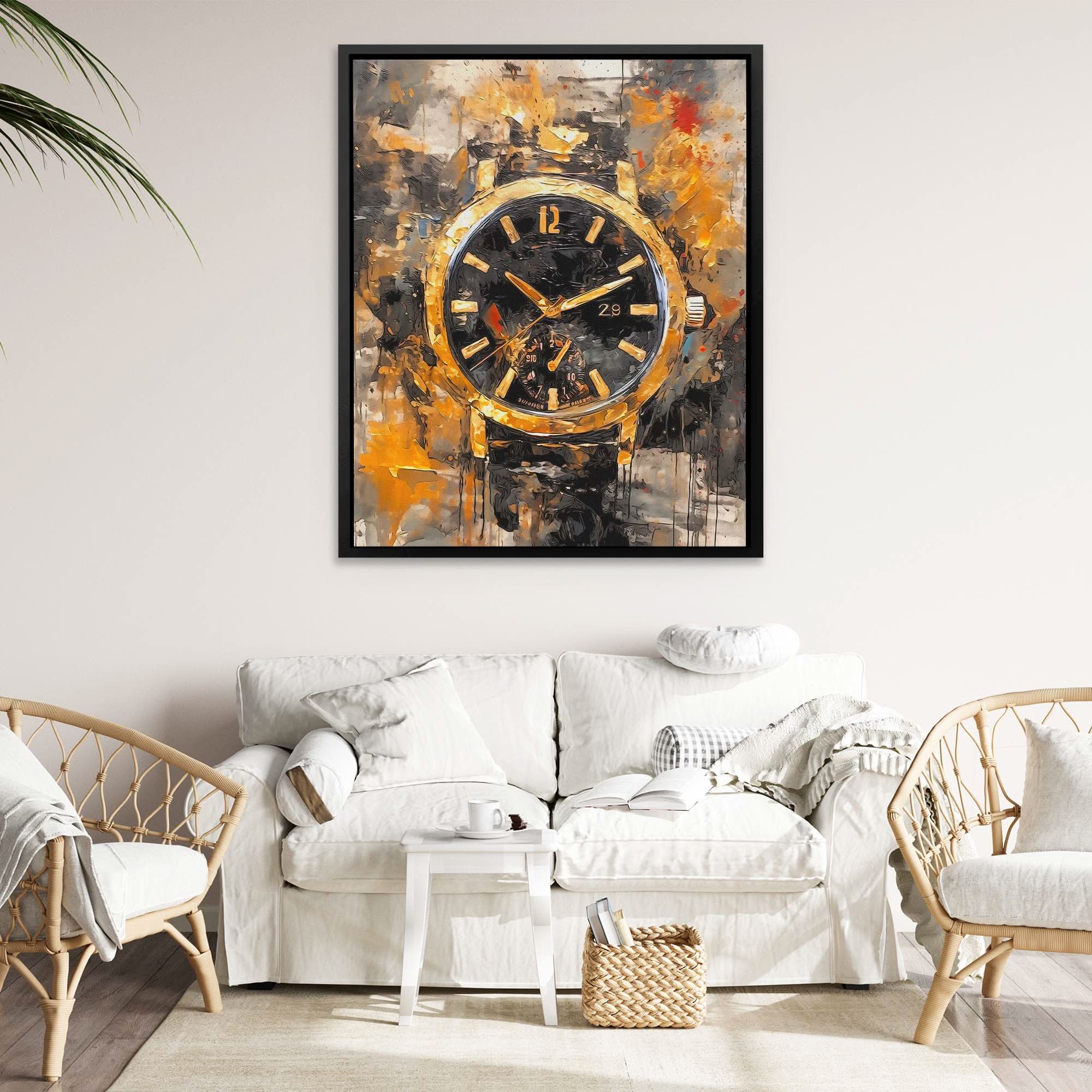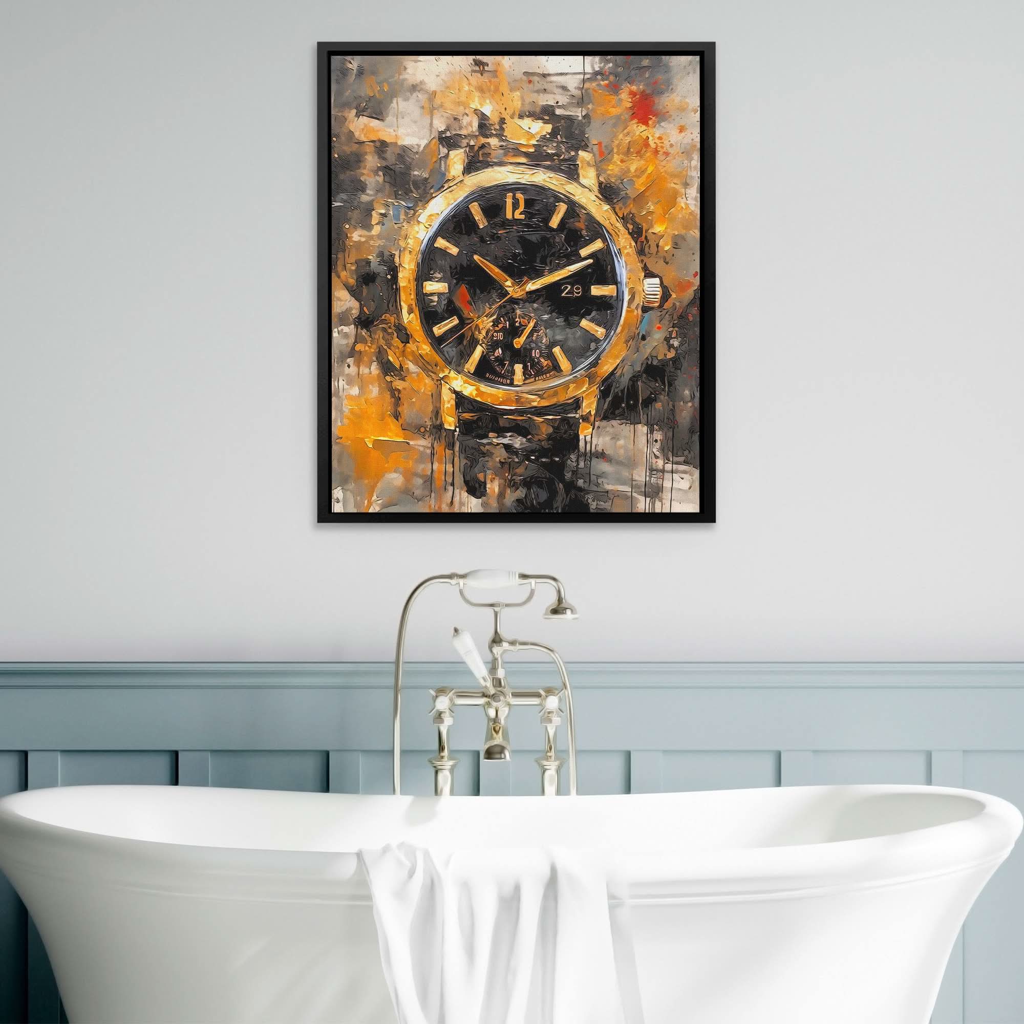 Immerse yourself in the elegance of "Time Forgotten," a luxurious abstract canvas print featuring a mesmerizing black and gold wrist watch painting.