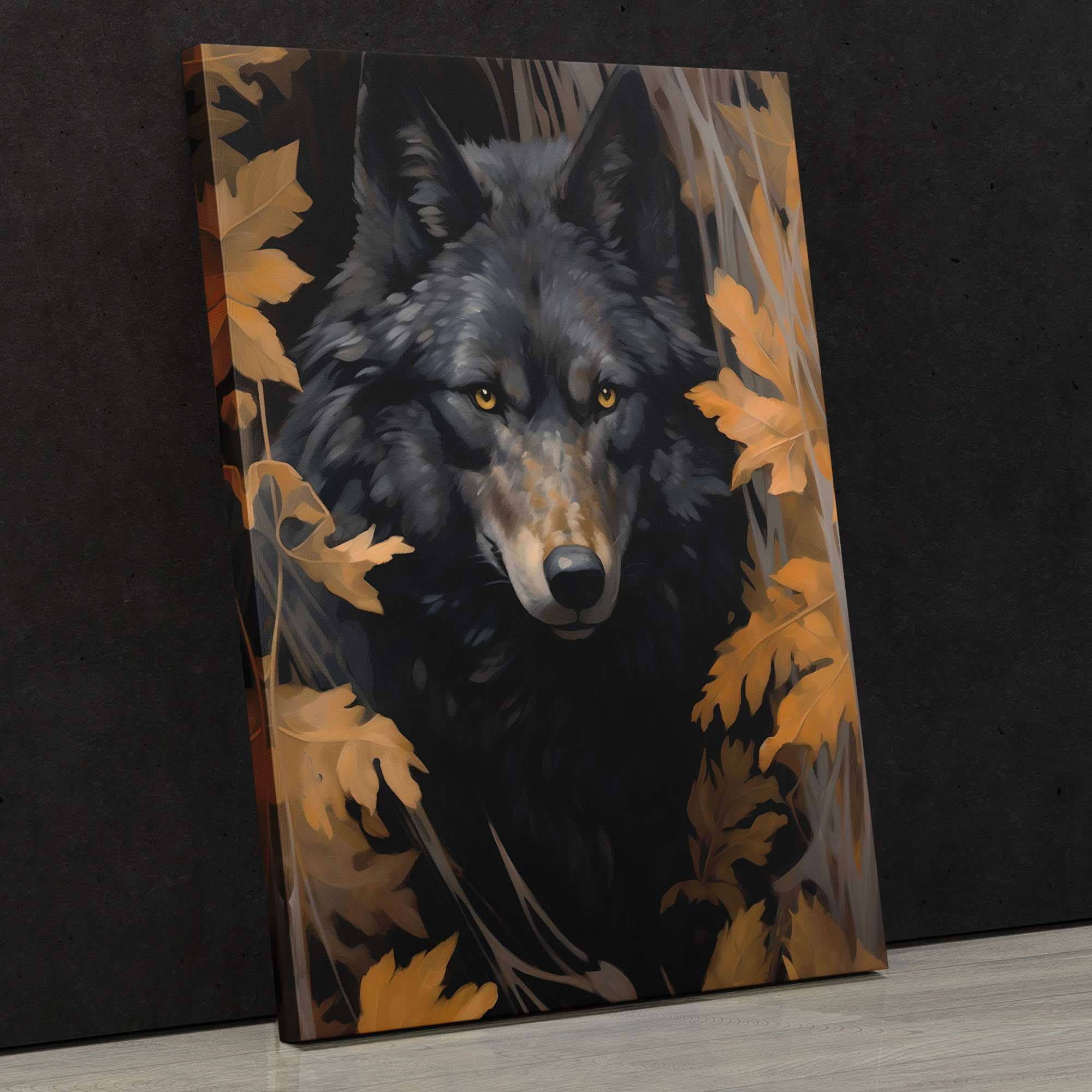 Adorn your space with the majesty of the "Obsidian Wolf" canvas art print. The primal strength of the black wolf comes alive in this sophisticated black and gold wolf painting, making it an attractive choice for wolf lovers and enthusiasts of impactful decor.