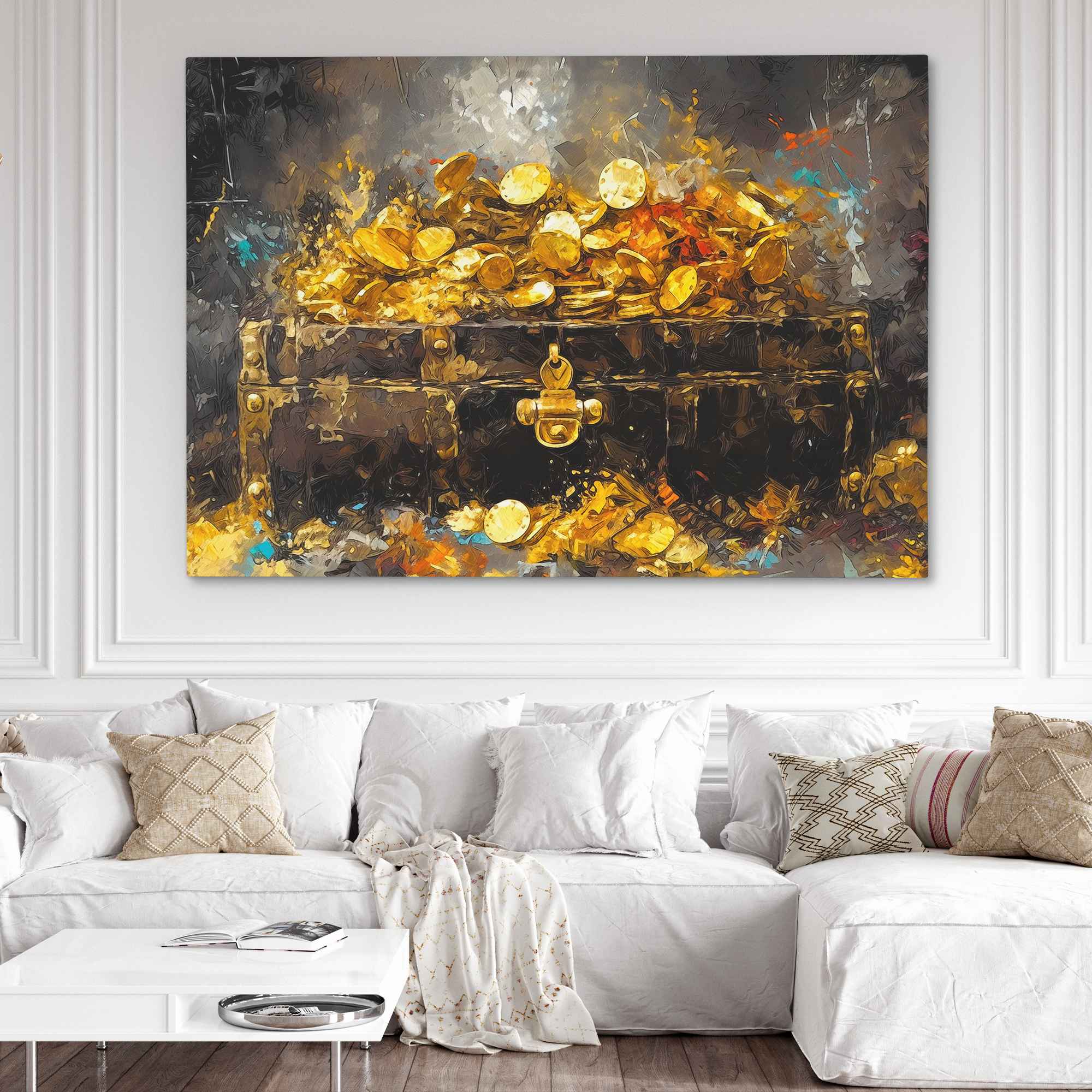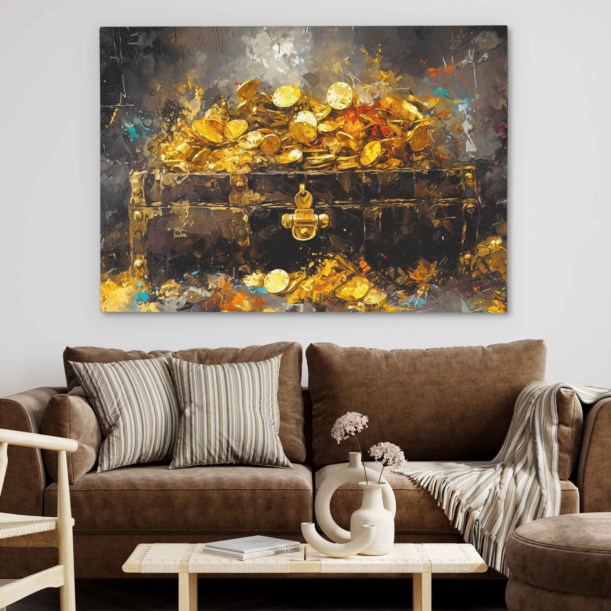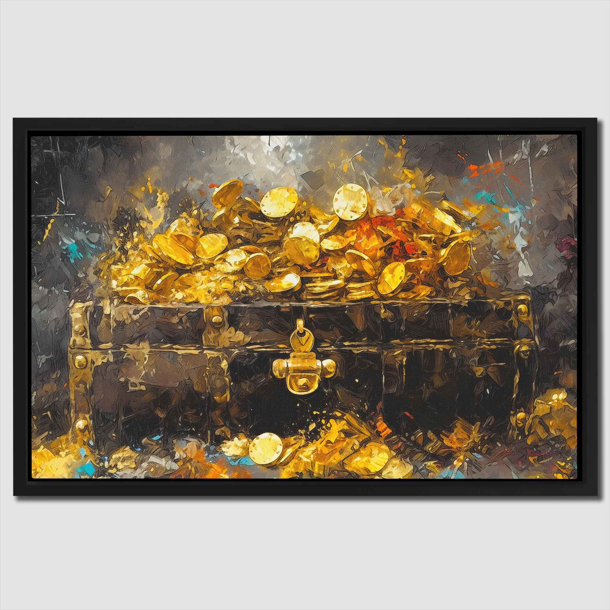 A treasure chest overflowing with gold and jewels in warm tones. Treasure in Sight is pirate art that works in game rooms and gold-themed walls.