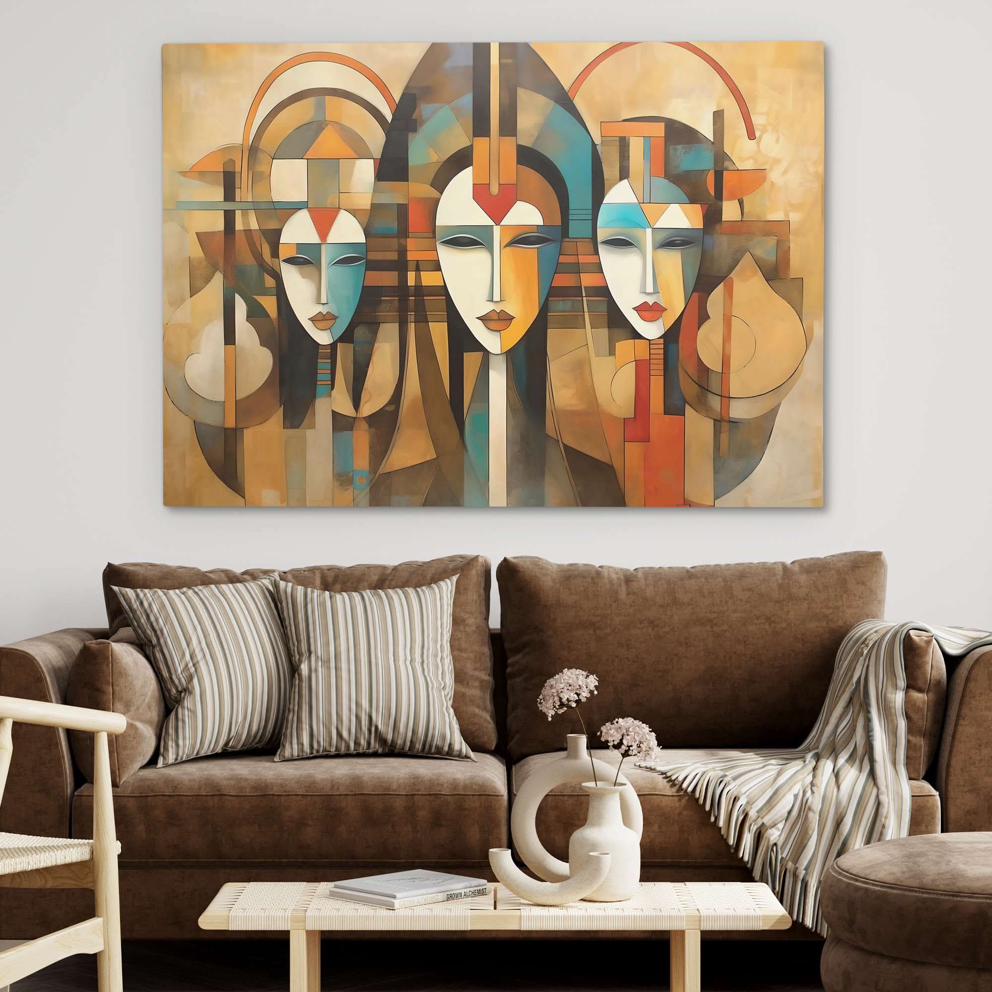 Feminine forms flow through the composition in warm beiges and browns, accented with gold that adds elegance to the abstraction. Tribute to Women celebrates femininity through simplified shapes and luxe tones. The neutral palette keeps things sophisticated while the gold details elevate the tribute.