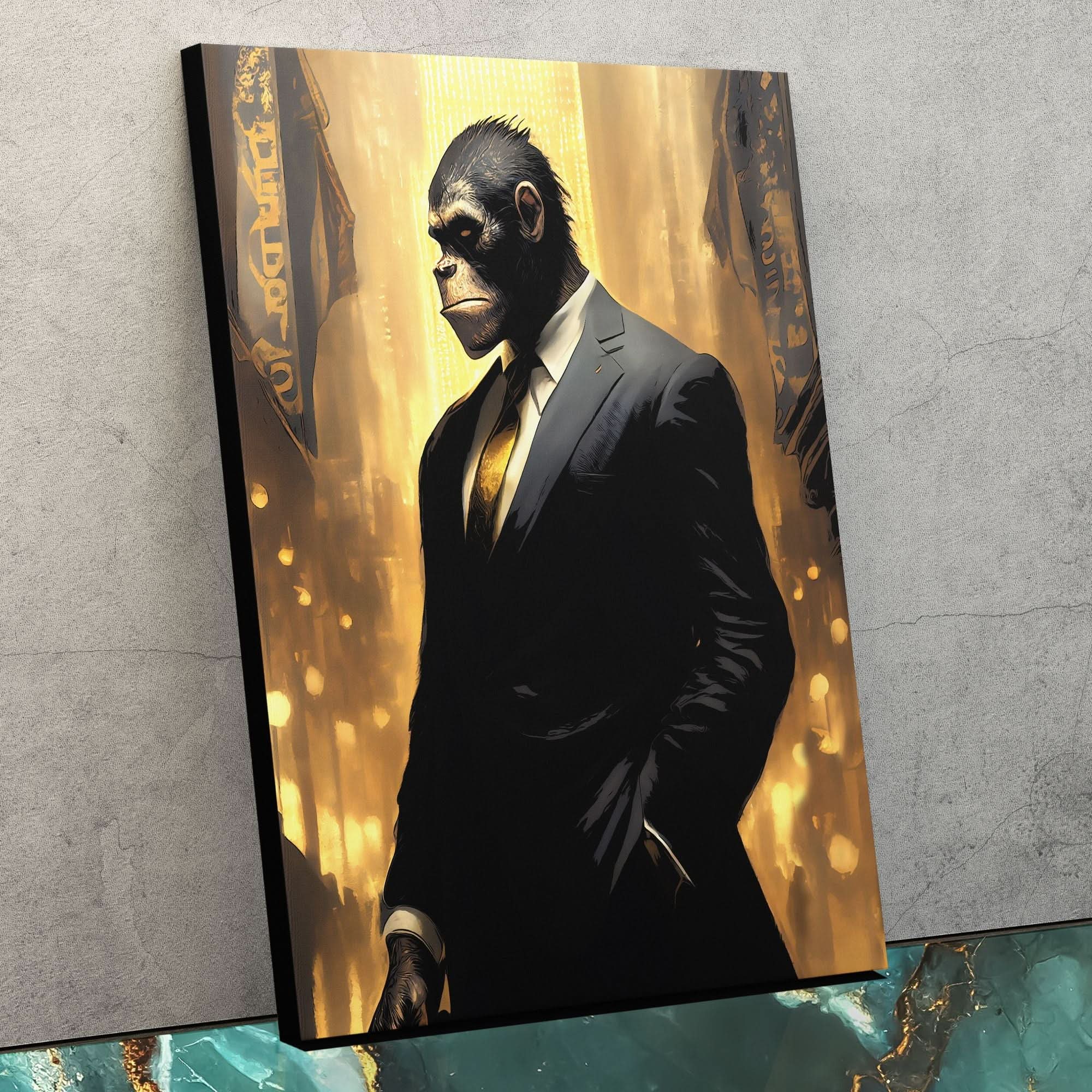 A gorilla in a tailored suit, painted with dead-serious detail. Wall Street Ape brings Wall Street humor to offices and man caves.