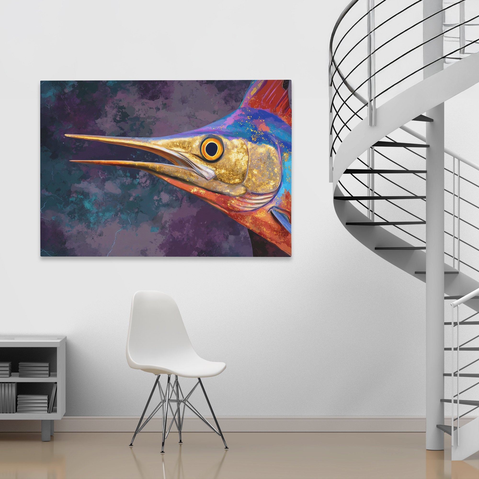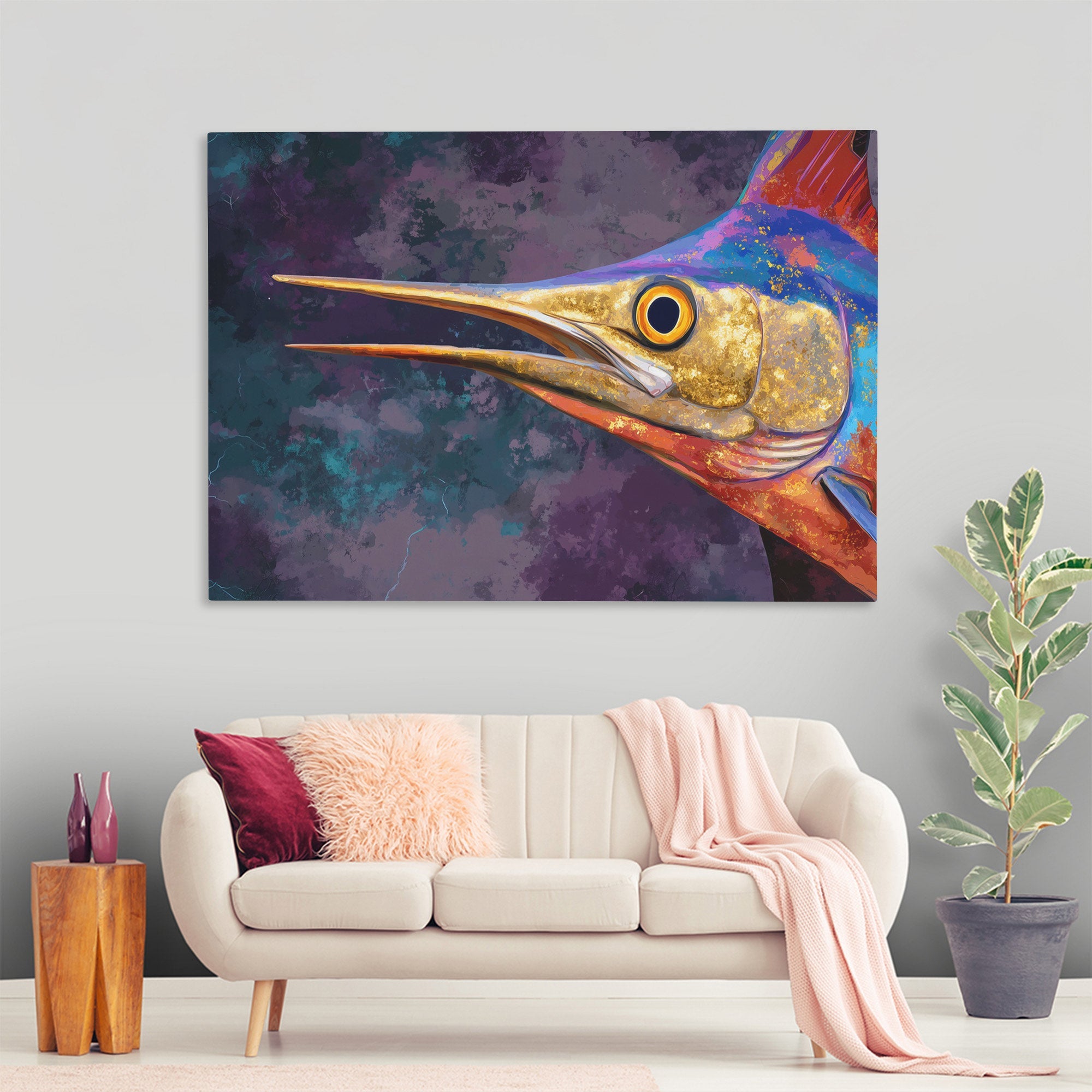 This marine piece brings dramatic ocean presence through vivid contemporary styling. The work suits living rooms, beach houses, or spaces that appreciate bold game fish imagery.