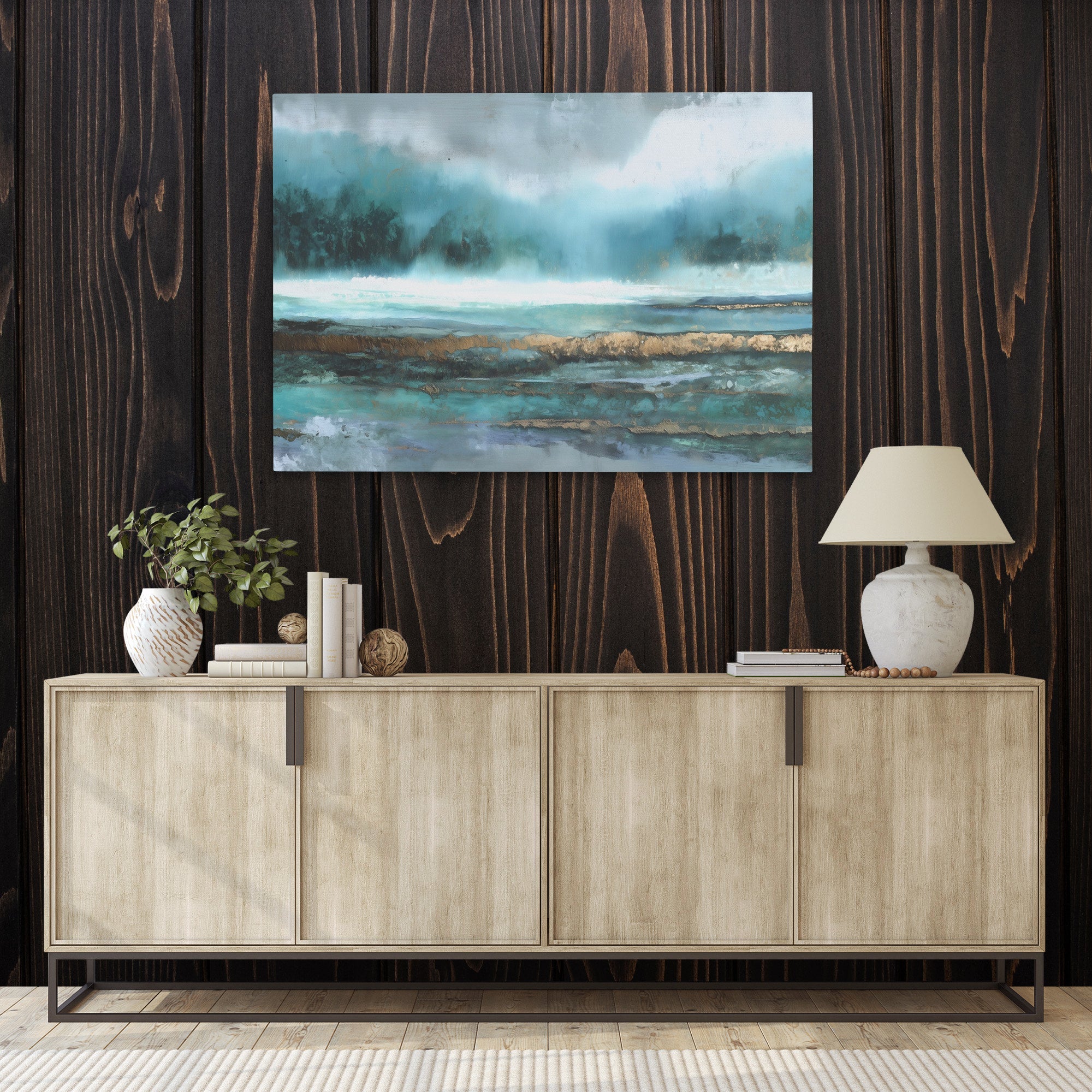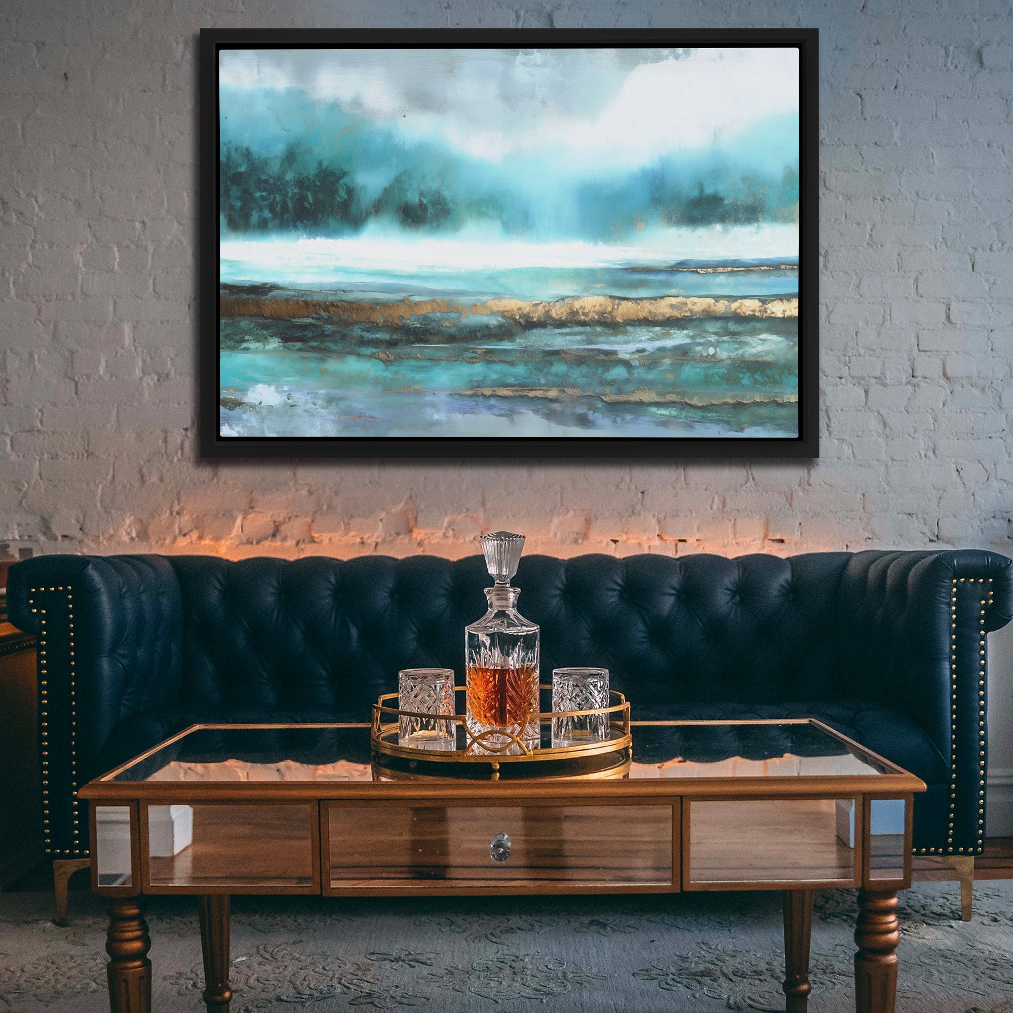 A strong fit for living rooms, offices, or bedrooms that want something calming and sophisticated on the wall. The teal and gold palette reads modern and coastal without being kitschy.