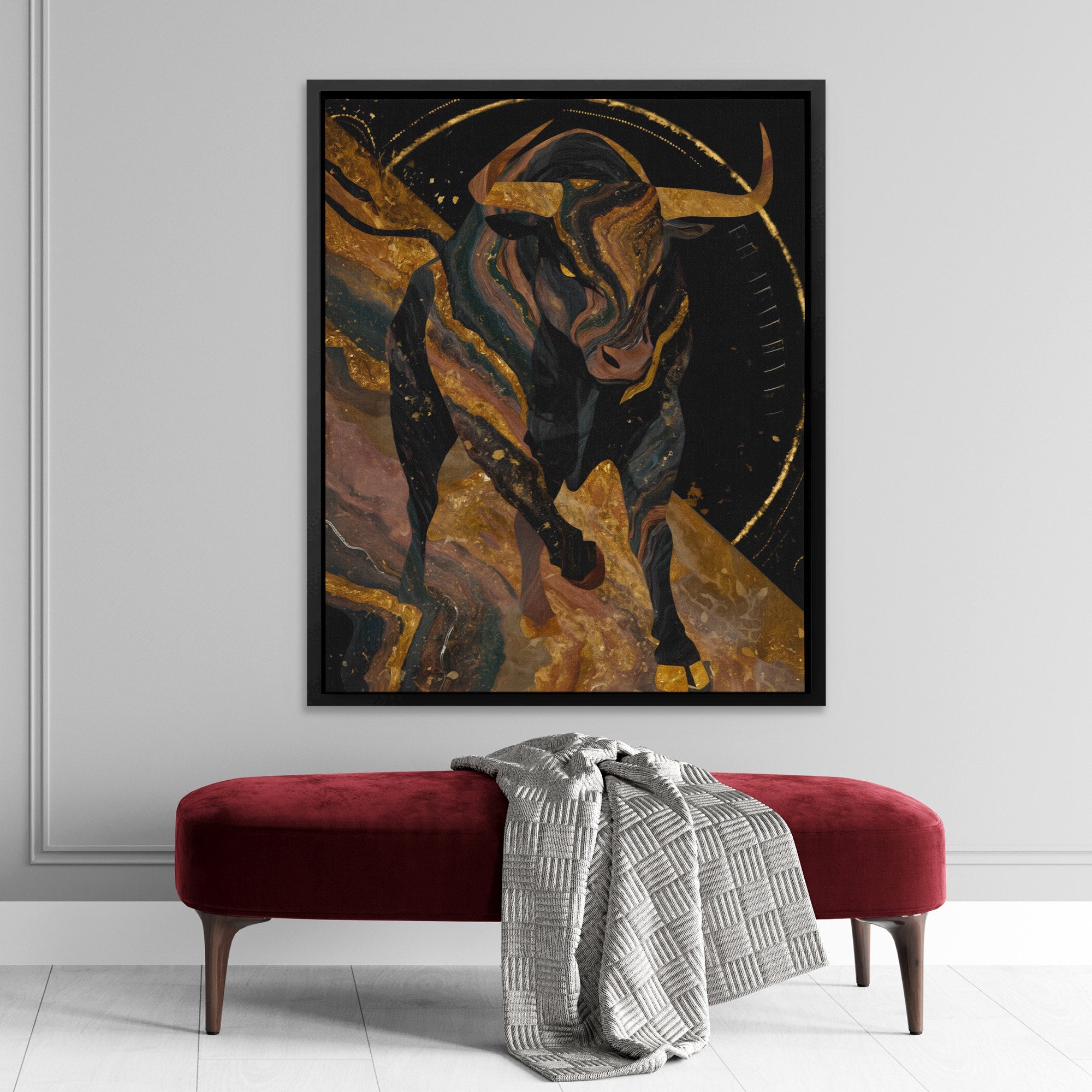 Bull in flowing liquid gold abstraction. A bold piece for any modern living room.