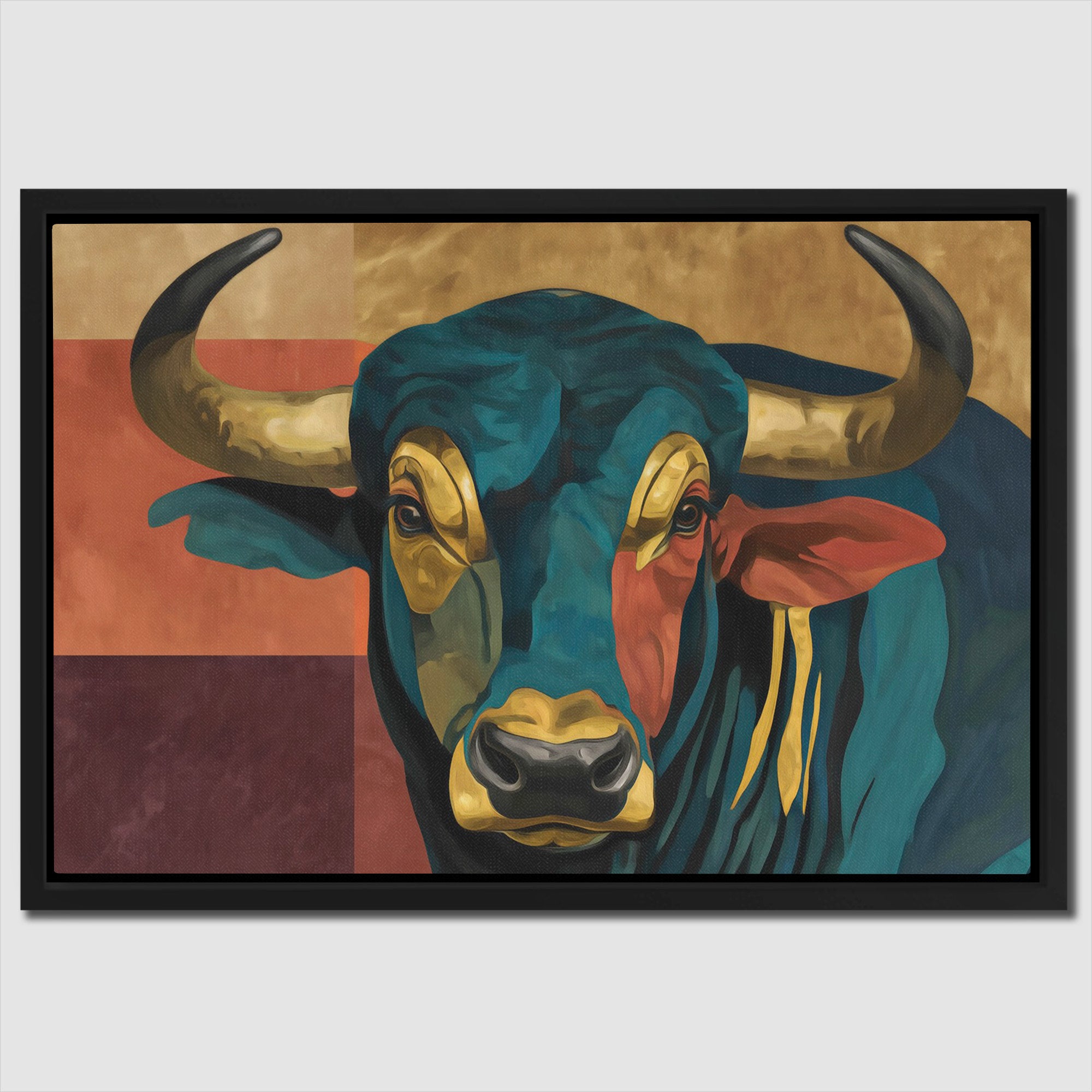 A bull or cow appears in close-up frontal view with curved horns and distinctive bovine features. Stylized semi-abstract interpretation with bold geometric color blocking and simplified forms creates modern pop art aesthetic from the traditional farm subject.