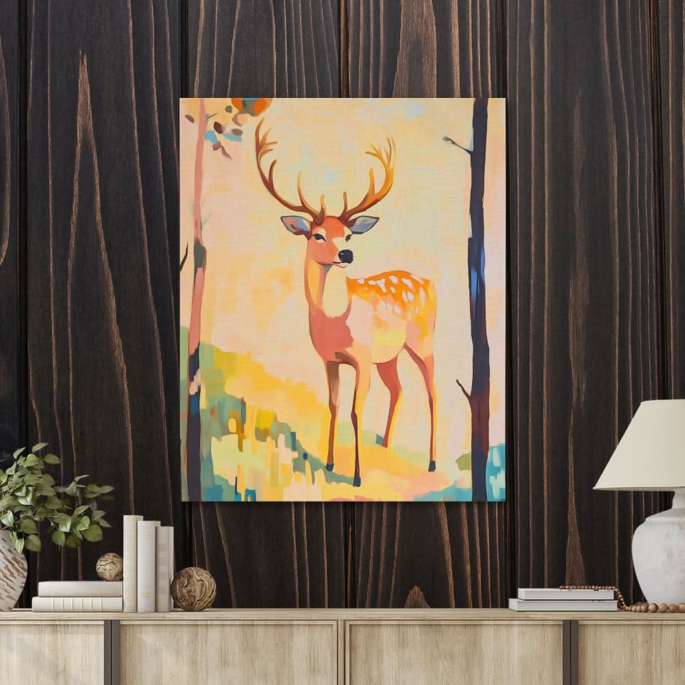 This graceful deer stands alert in a sunlit forest clearing, painted with a palette of golden beige, soft rust, and leafy green. The smooth color transitions and stylized brushstrokes lend a serene yet regal tone to the composition. Ideal for those who love wildlife art, rustic nature decor, and soft forest hues.