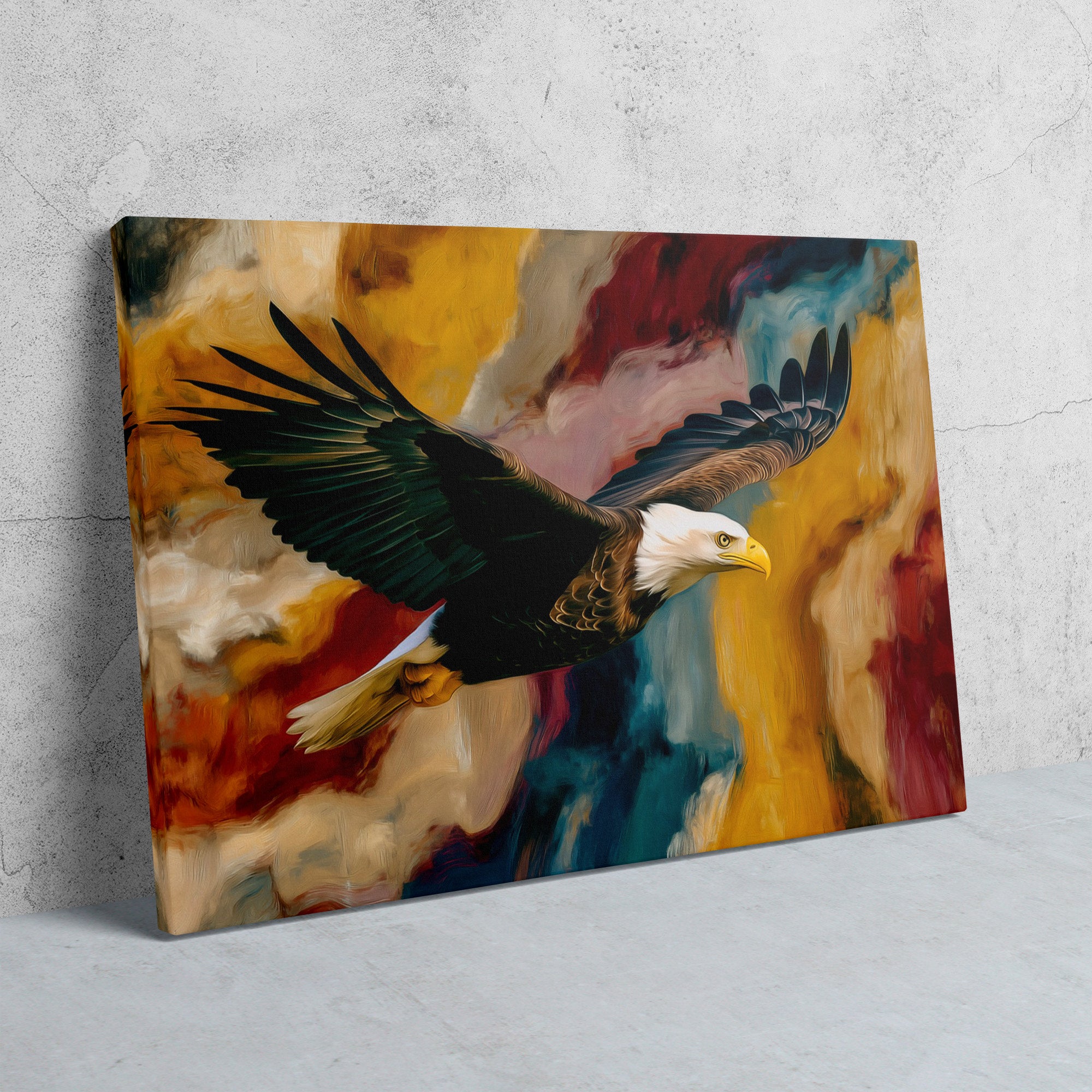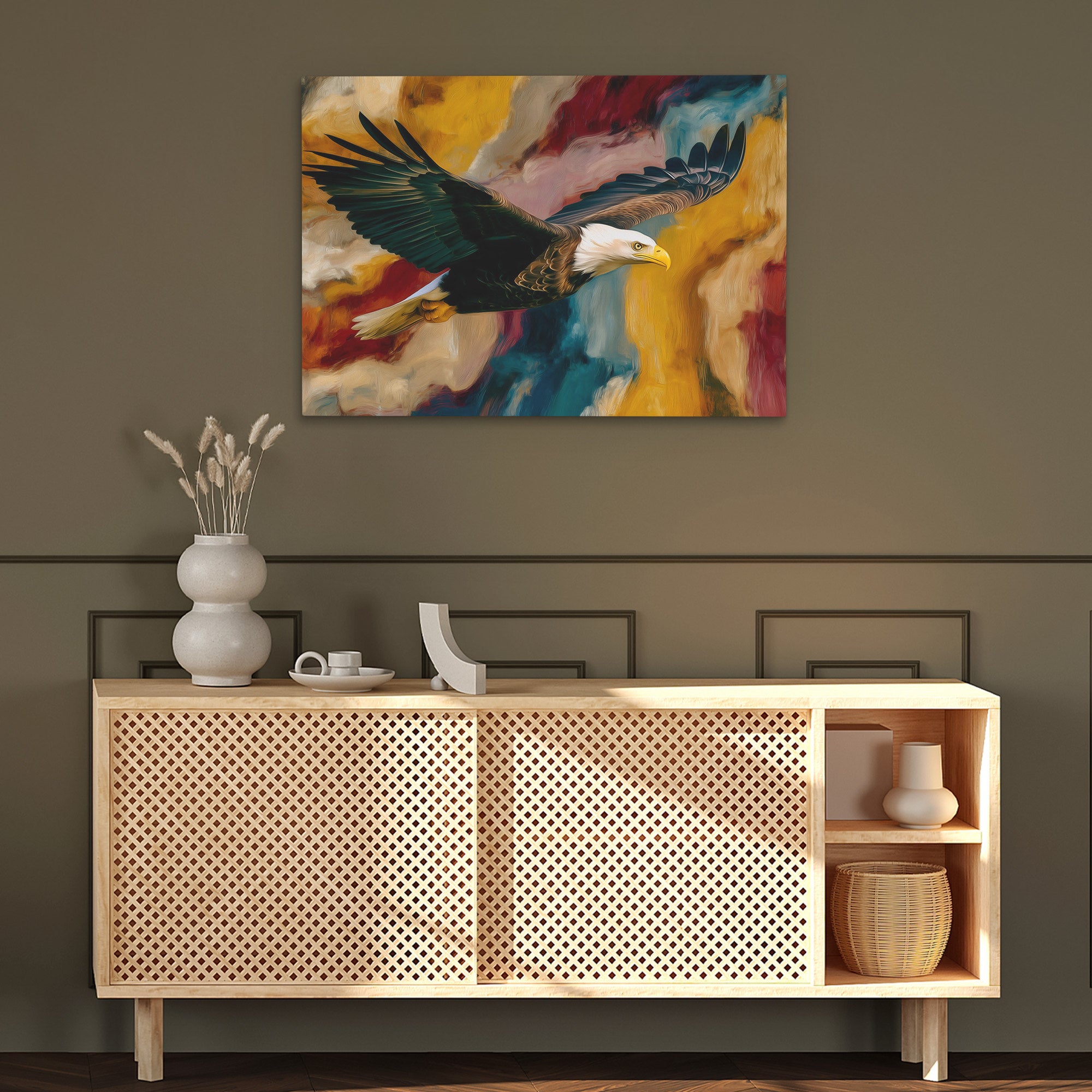 Eagle in flight with abstract backdrop. A dynamic piece for any living room.