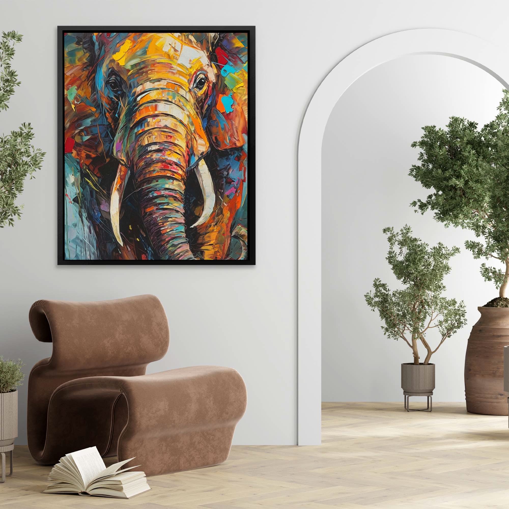 This abstract elephant painting features a mesmerizing portrait of an elephant walking, with its trunk elegantly wrapped around the bottom of the frame.