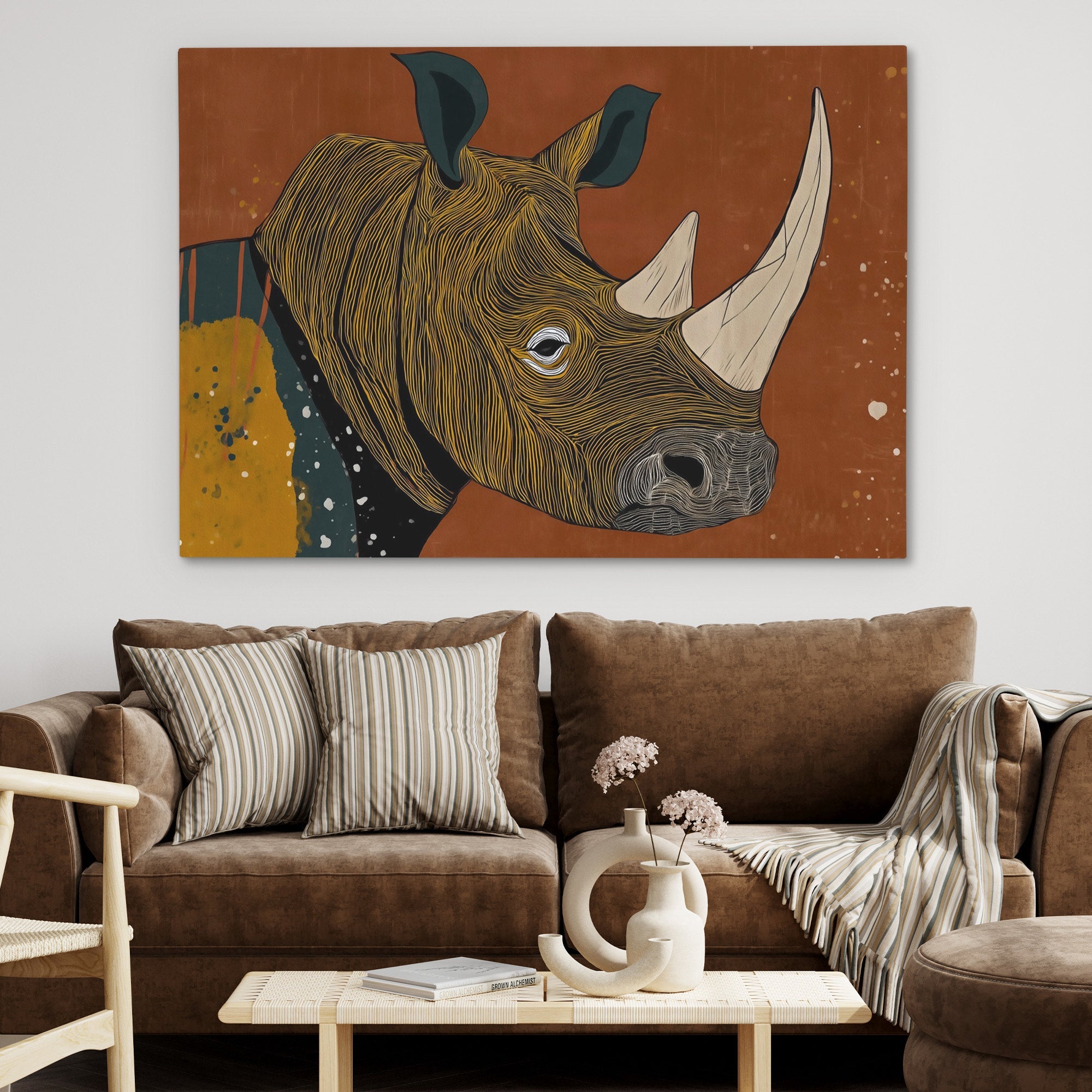 Rhinoceros with golden textures on rust background. A bold piece for any office.