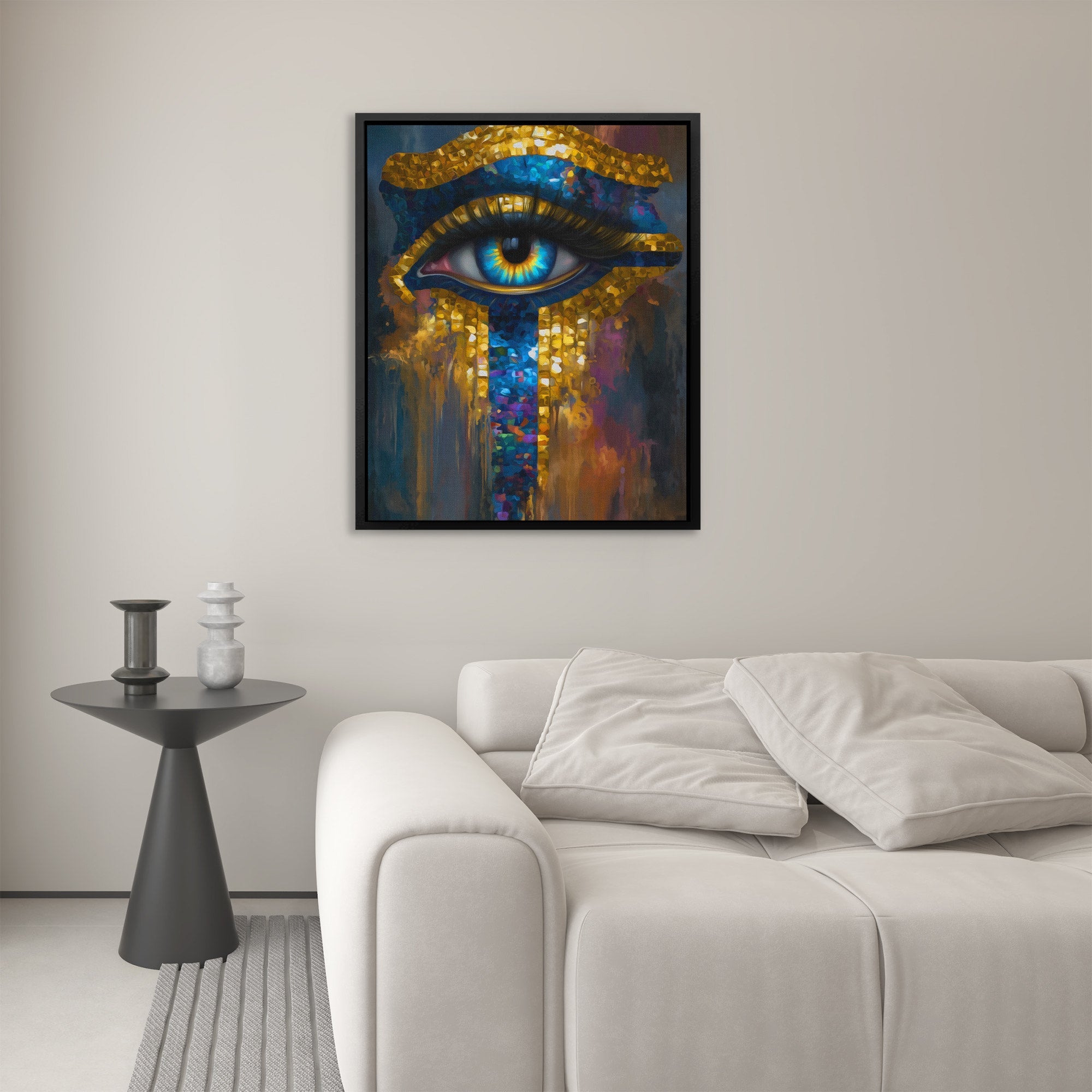 This piece reimagines Egyptian symbolism through a modern artistic lens, combining sacred geometry with fluid abstraction. The piece makes a powerful statement in home offices, creative studios, or anywhere that appreciates art with mythological depth.