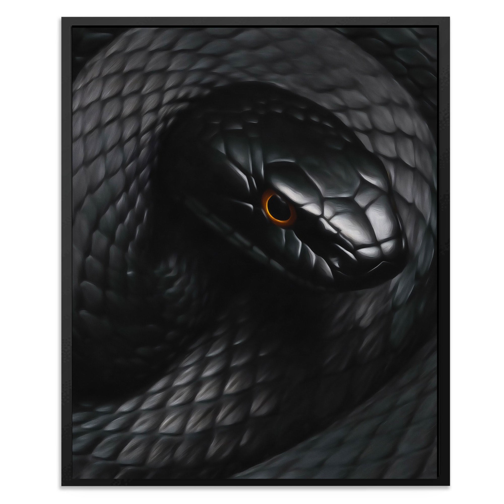 A coiled snake with amber focus. Dark, detailed, and dramatic. Works in living rooms, man caves, or spaces drawn to the mysterious.