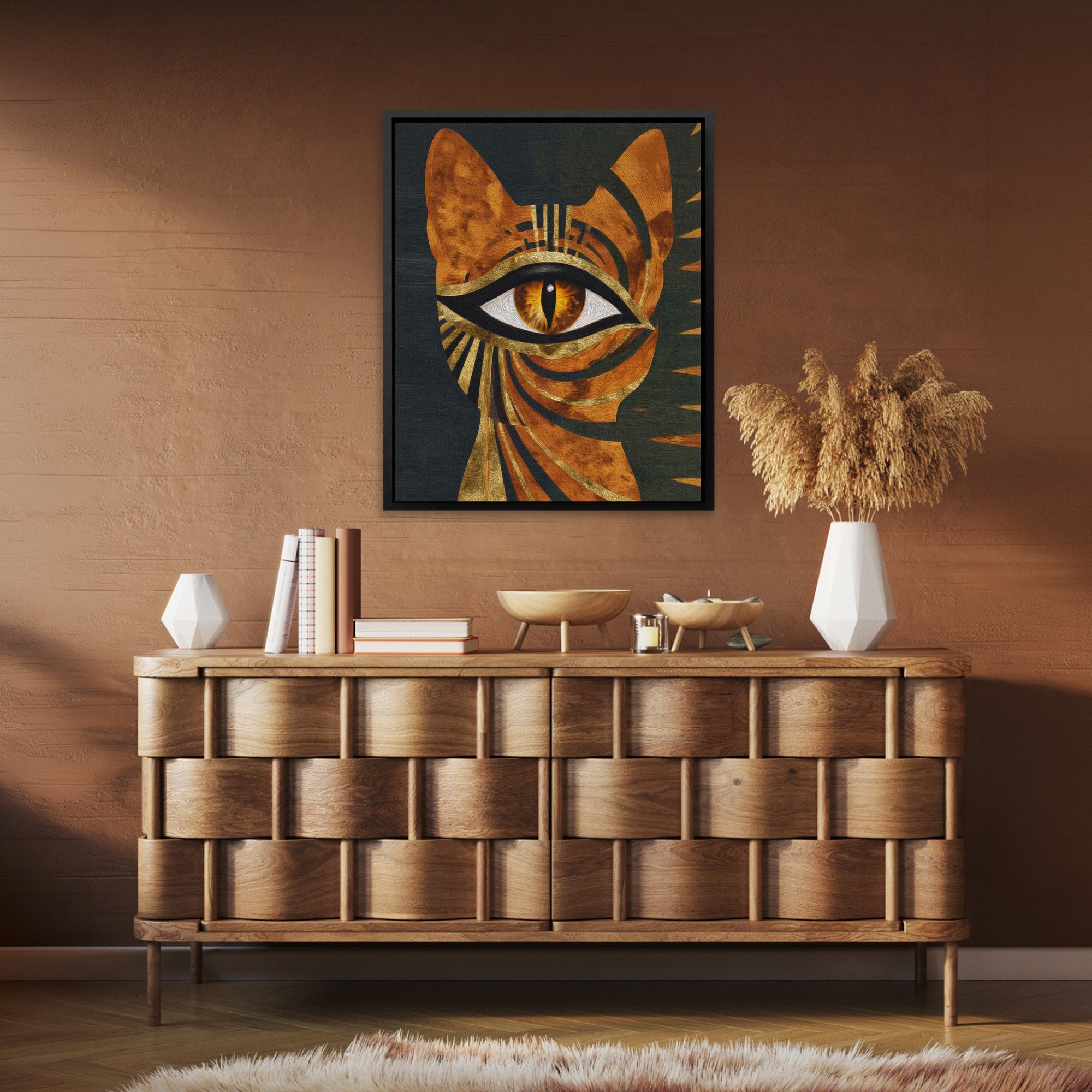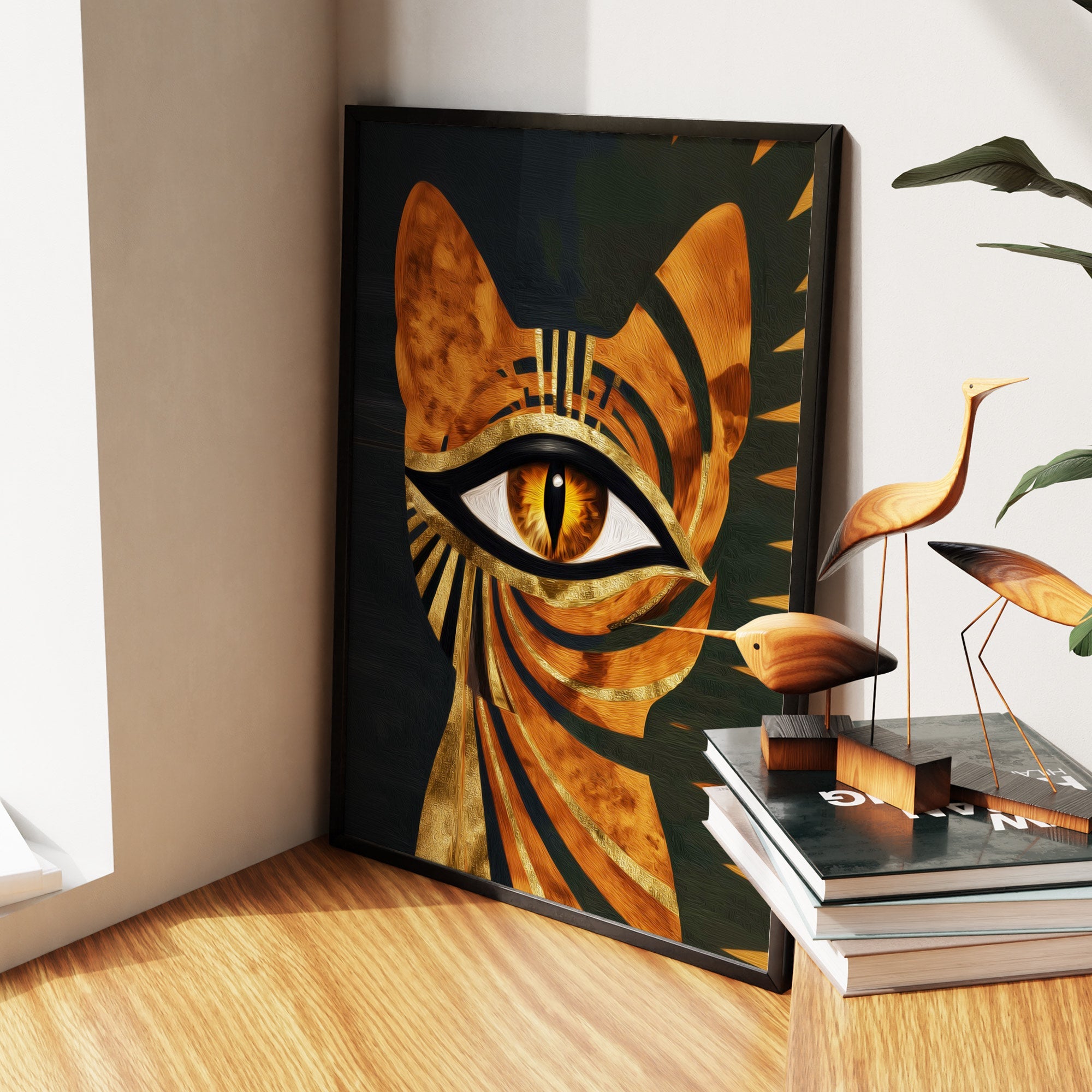 A cat in ancient gold patterns. Decorative and mystical. Perfect for living rooms, bedrooms, or spaces with ornamental taste.