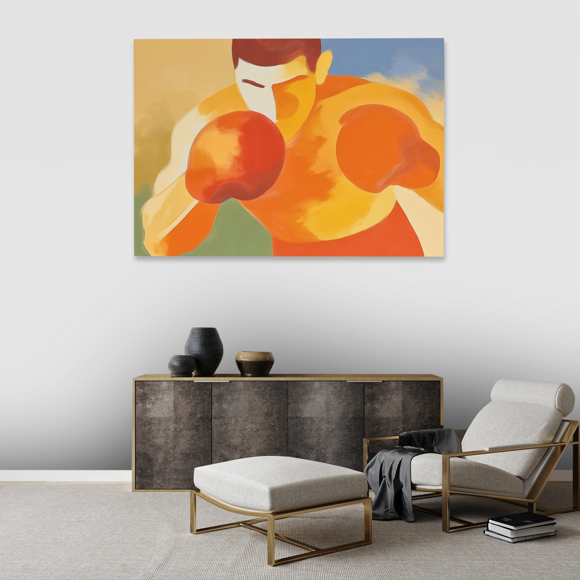 This piece captures boxing intensity through bold simplified forms. The work brings athletic energy to home gyms, game rooms, or spaces that appreciate sports art with contemporary abstraction.