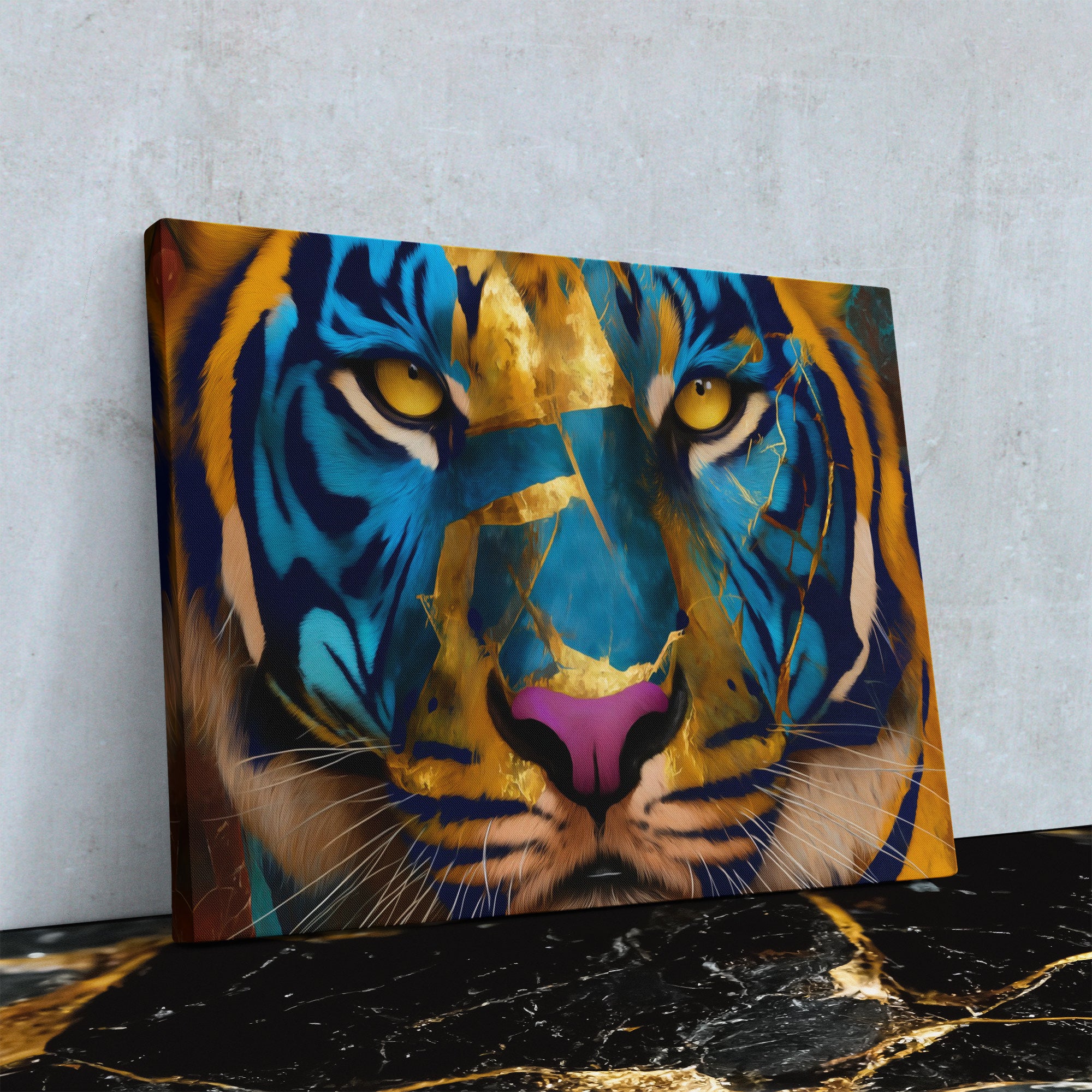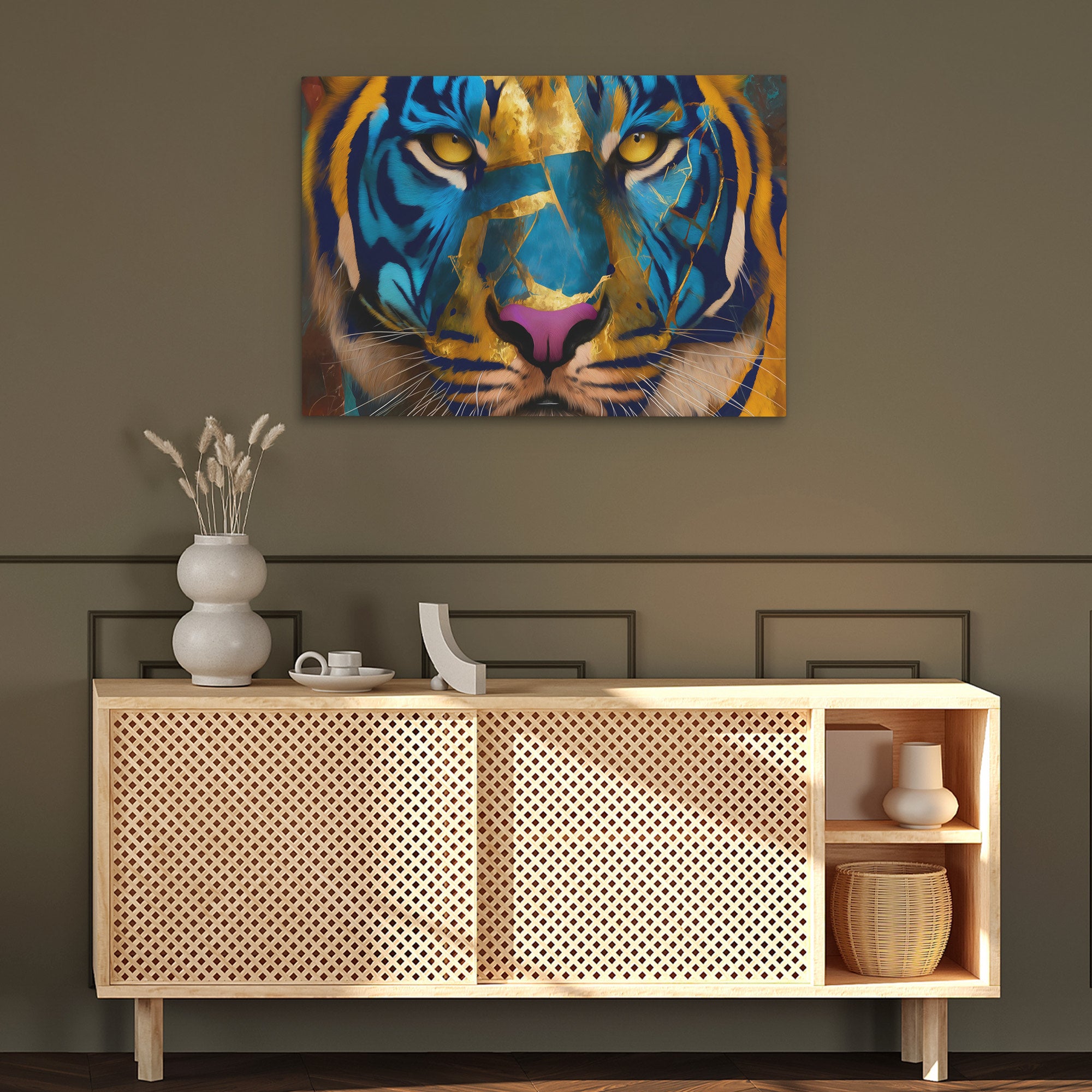This abstract piece turns the tiger through bold geometric fragmentation. The work brings striking visual impact to living rooms, home offices, or spaces that appreciate big cats with contemporary abstraction.