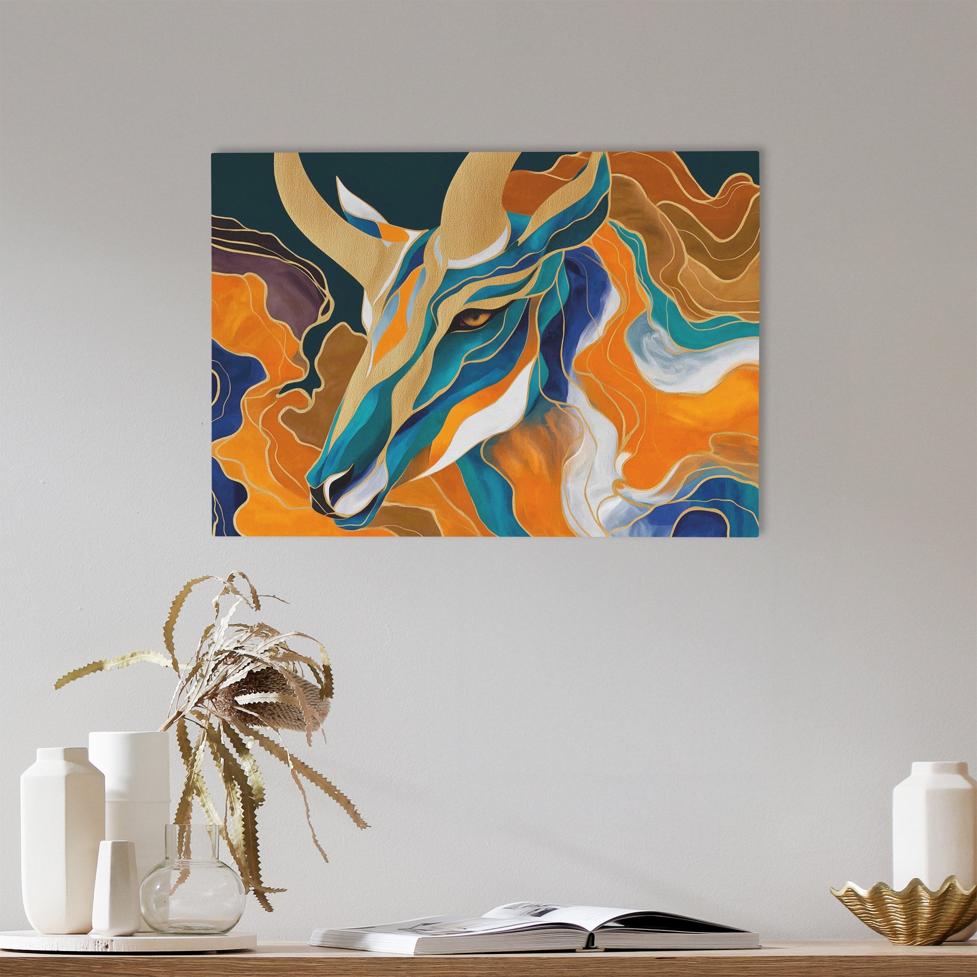 A gazelle in flowing art nouveau lines of orange, teal, and gold. Warm, colorful animal art for living rooms and bedrooms.