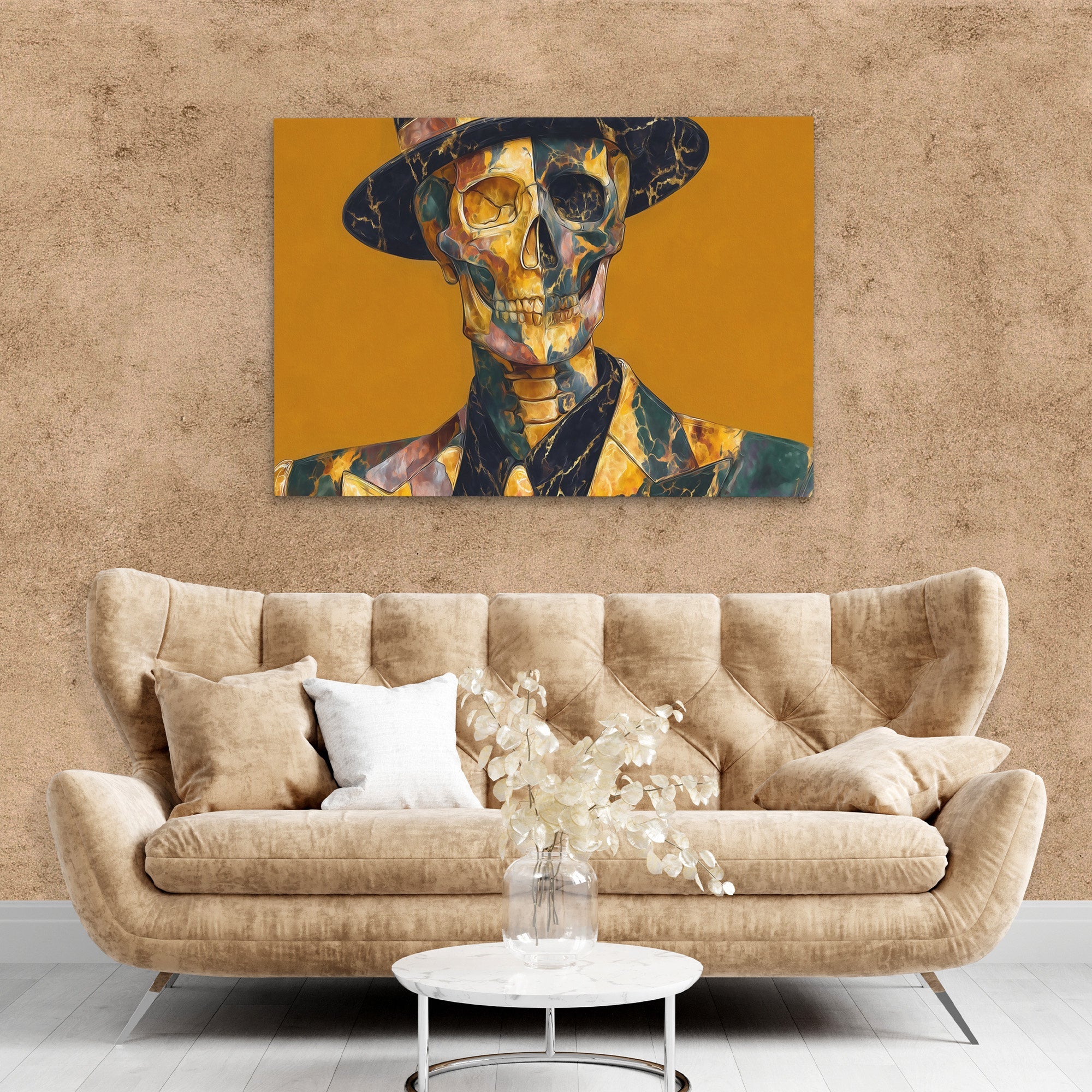 This dramatic piece blends mortality with elegance through sophisticated treatment. The work brings dark sophistication to man caves, home offices, or spaces that appreciate gothic imagery with refined style.