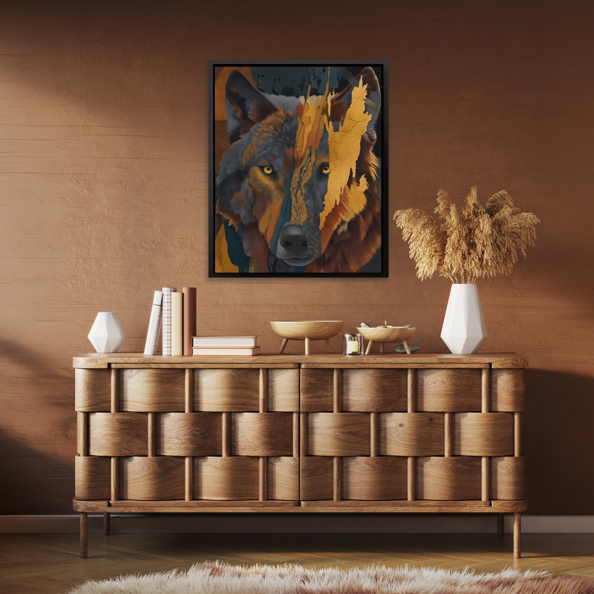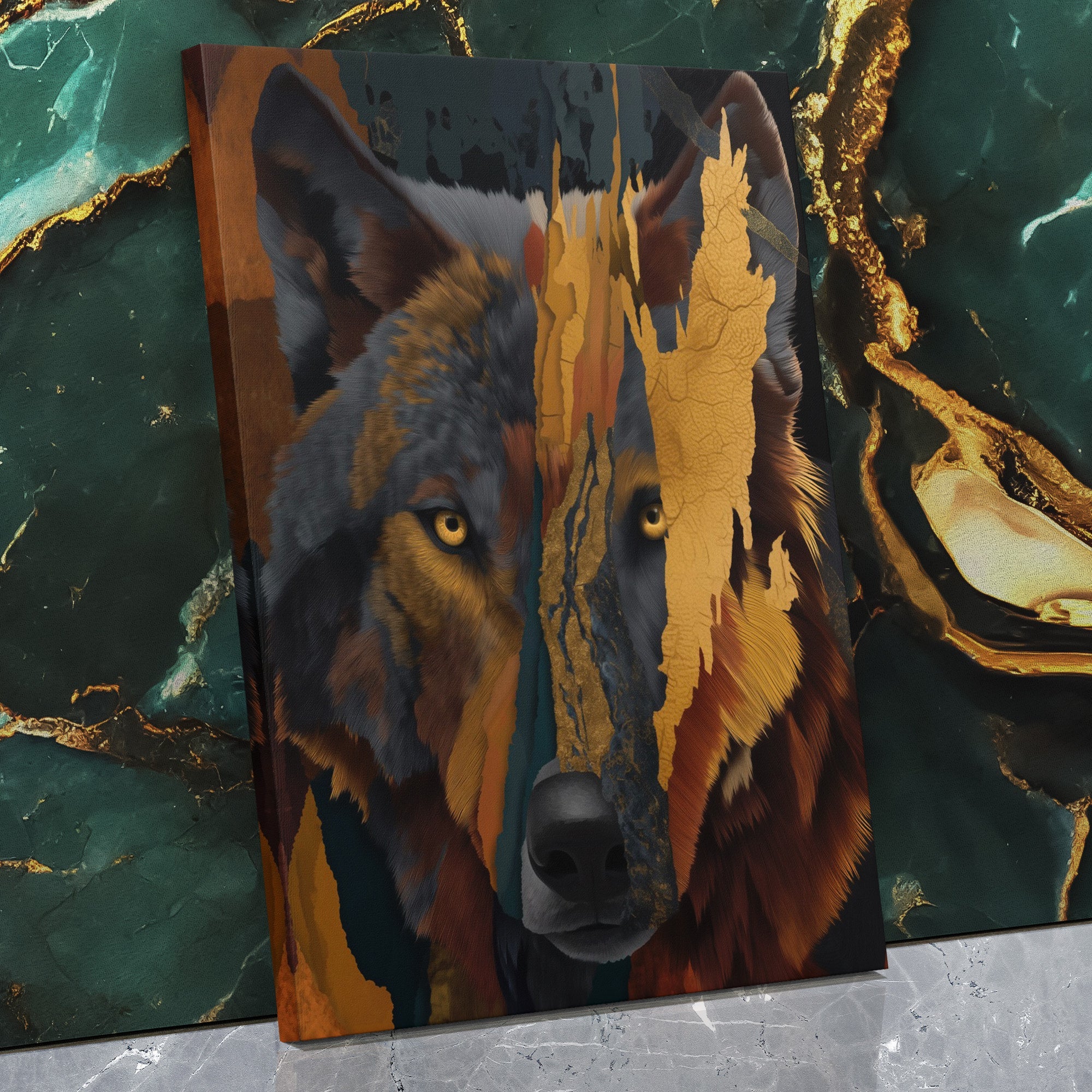 The wolf stares through shattered layers of gold and shadow. Primal energy meets modern composition. A solid choice for living rooms, offices, or spaces that want wildlife with attitude.