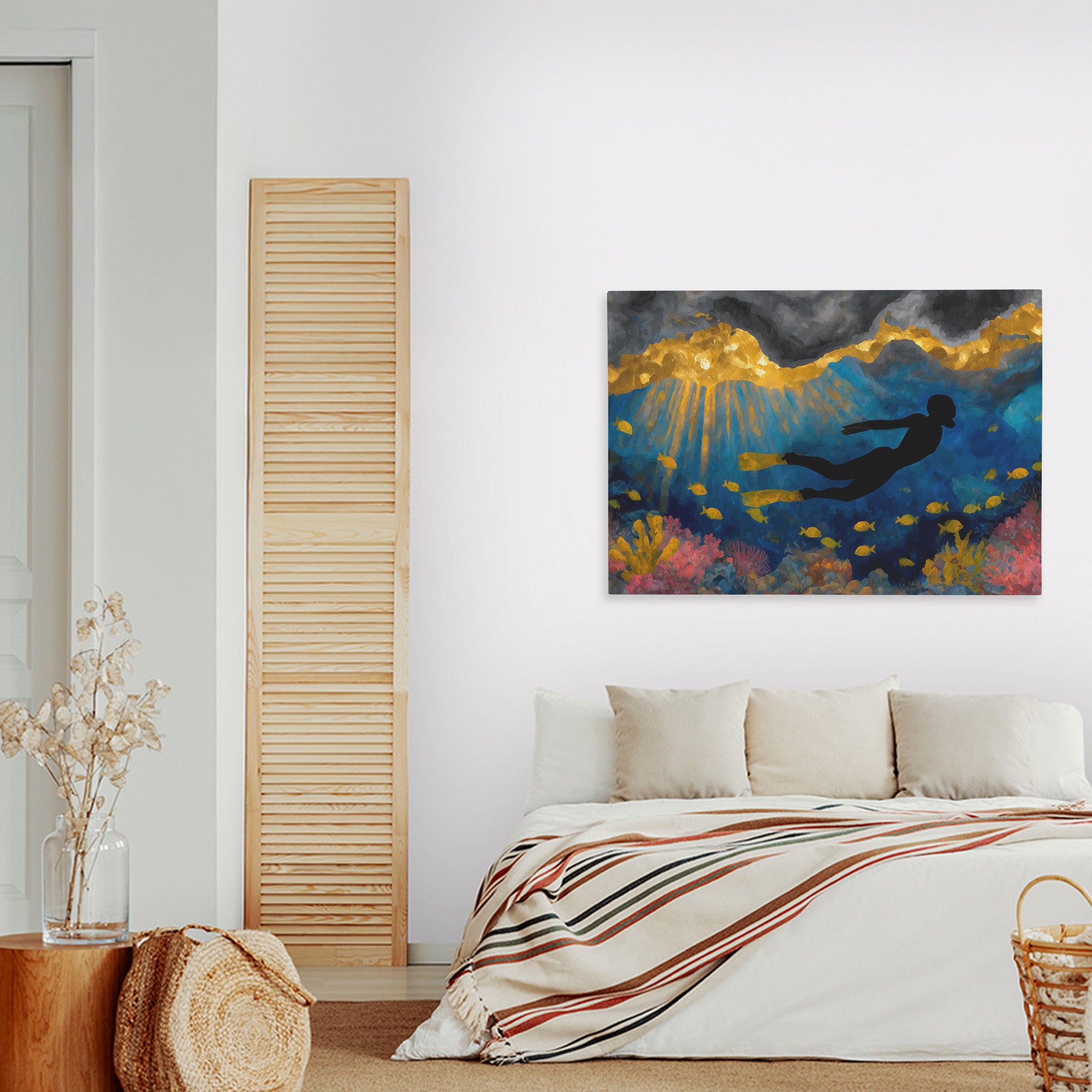 Diver in reef with gold metallic accents. A textured piece for any beach house.