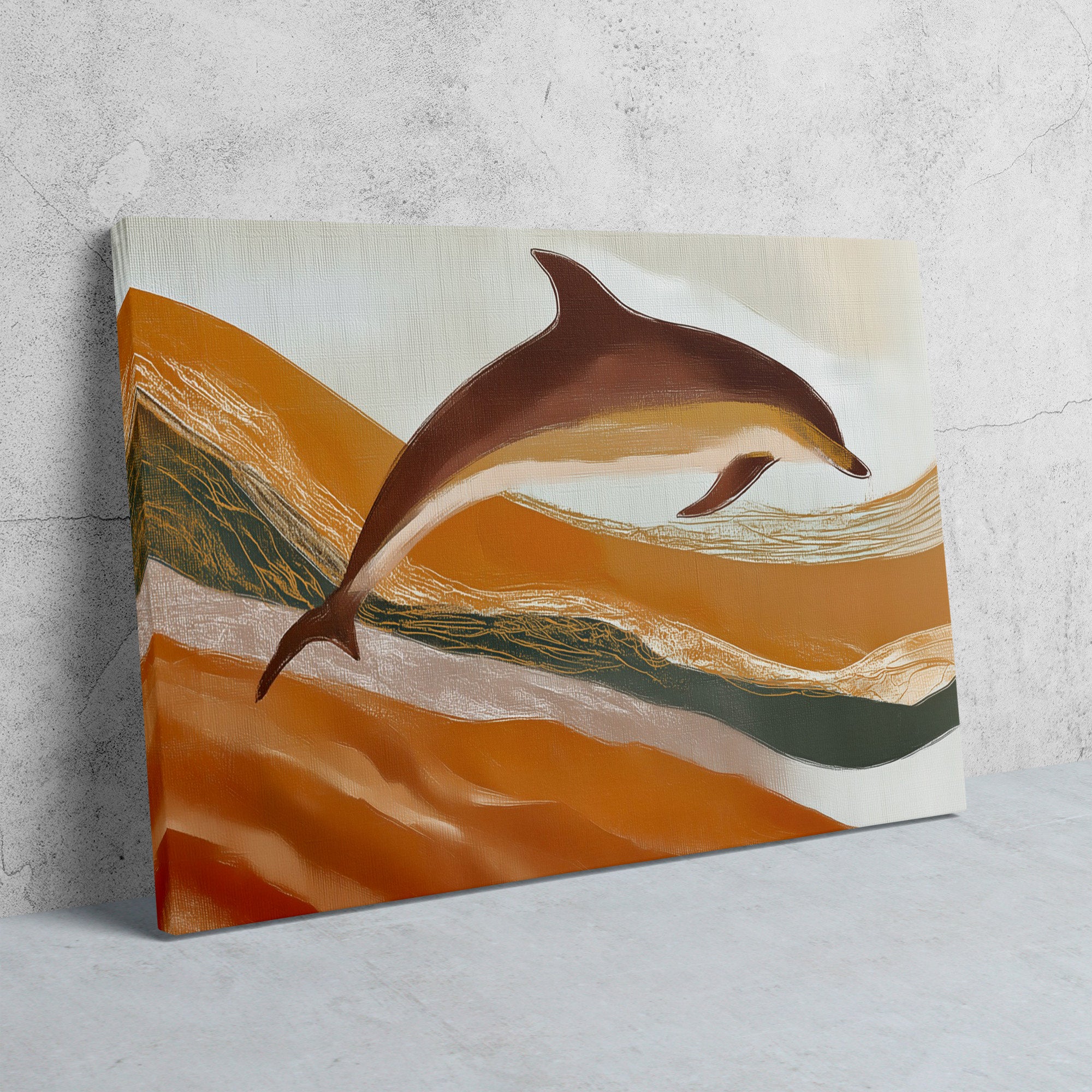 This dynamic piece captures dolphin play through flowing warm treatment. The work brings joyful marine energy to living rooms, beach houses, or coastal spaces seeking playful dolphin imagery.