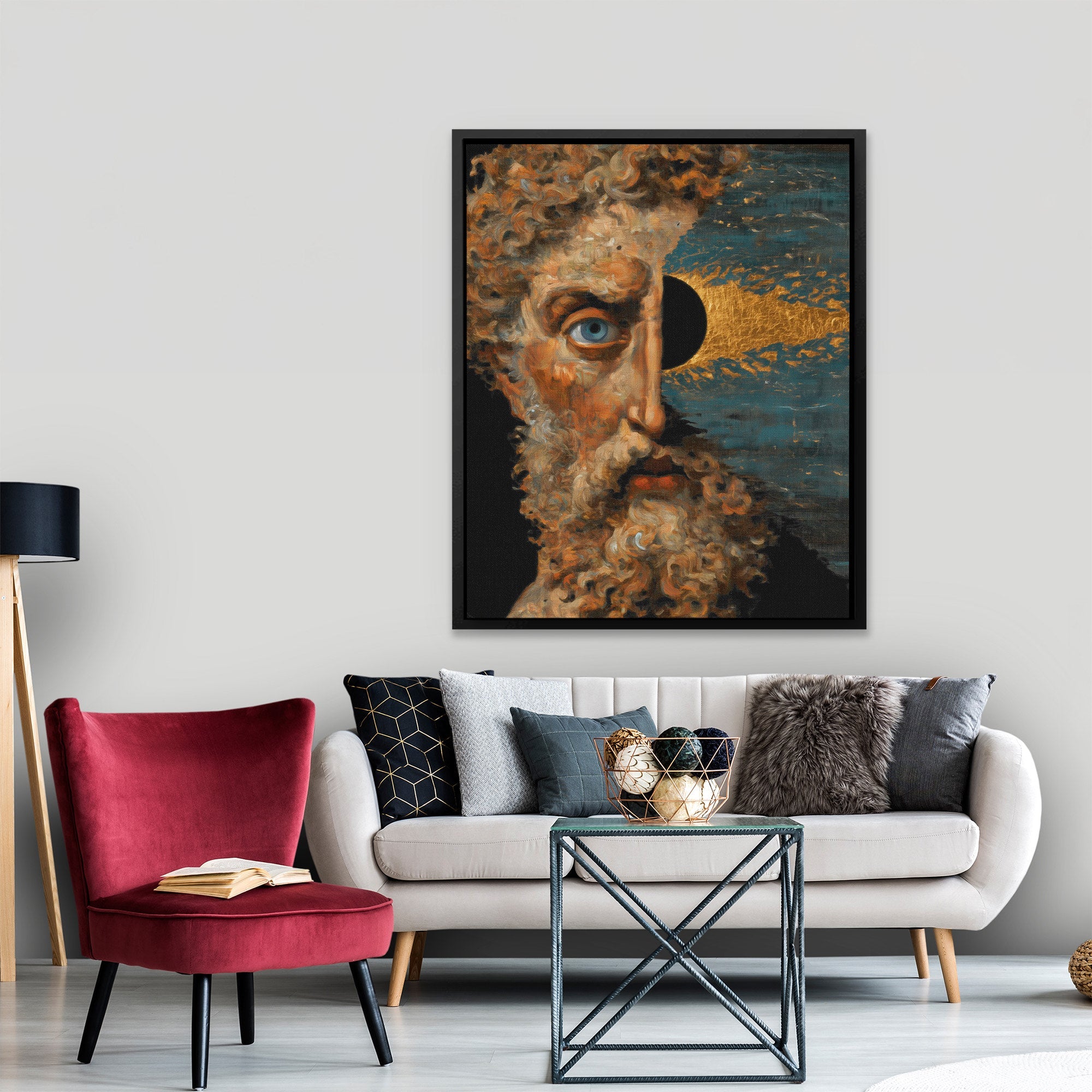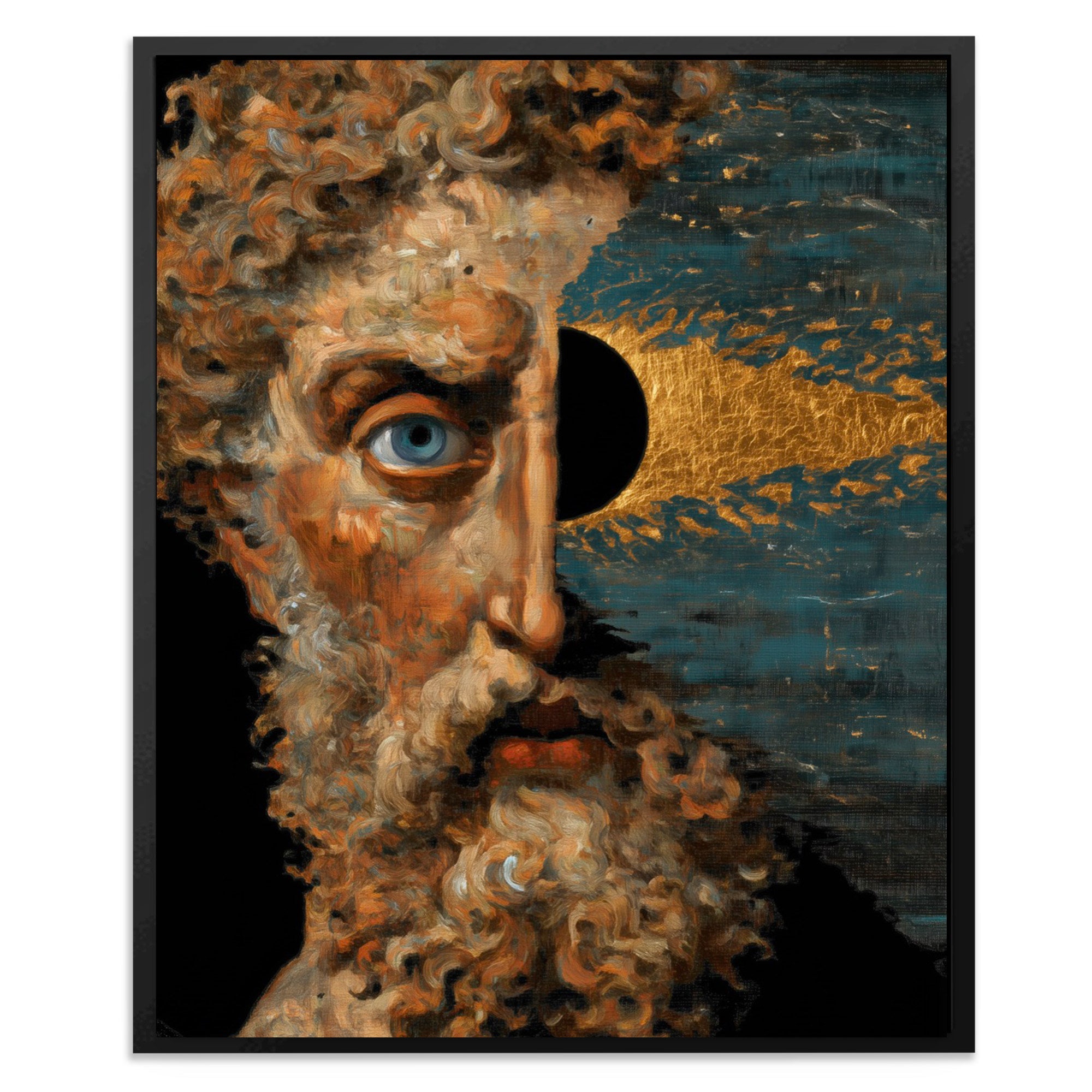 A sage with landscape elements. Surreal and wise. Works in studies, living rooms, or philosophical spaces.