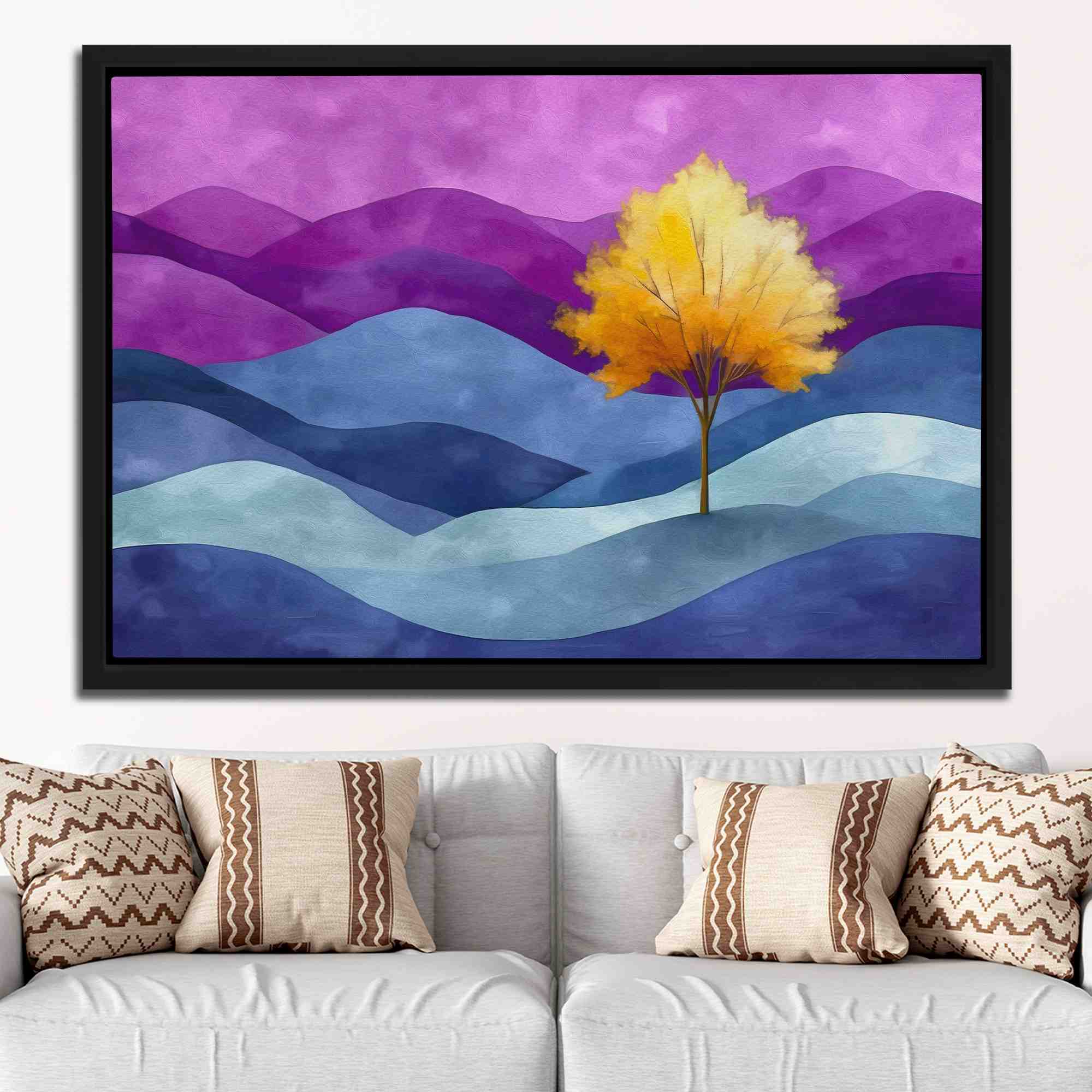 A luminous tree against colorful abstract hills. Tree of Gold brings warm natural beauty to walls seeking bold landscape art.