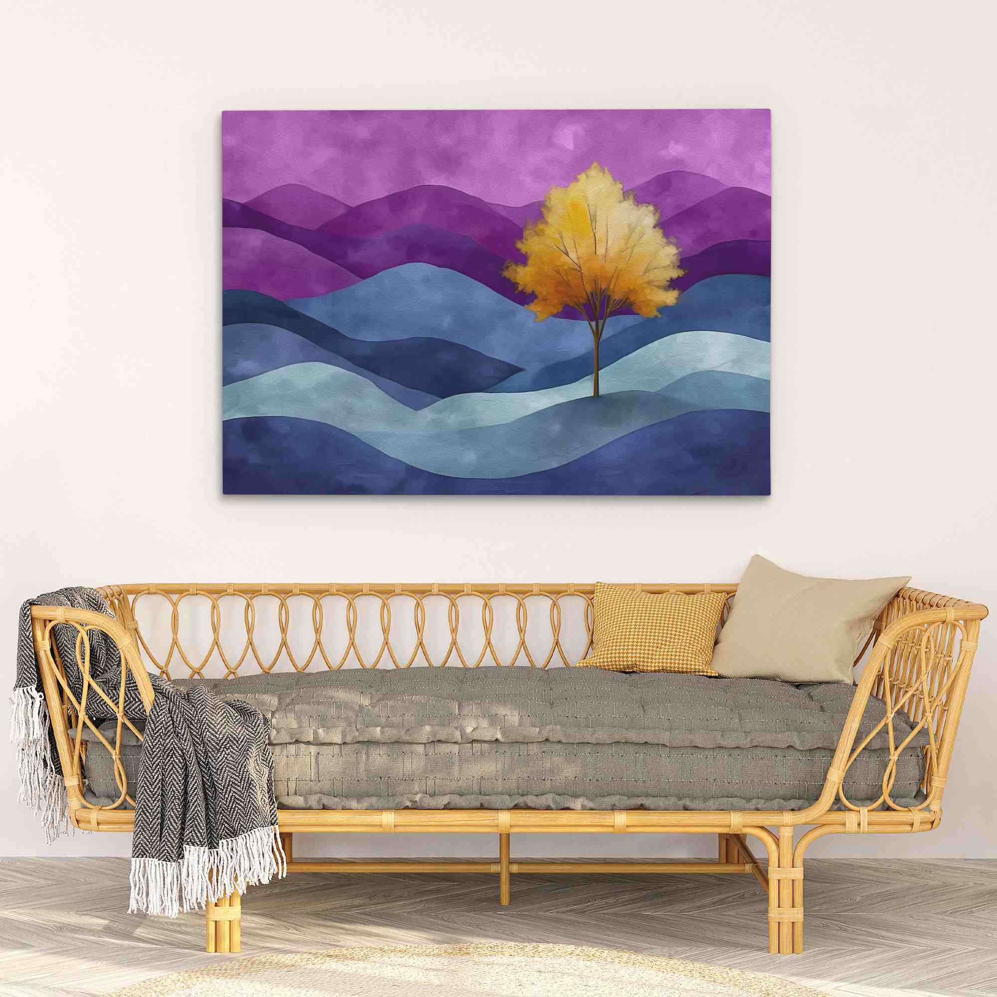 A golden tree glows against rolling purple and blue hills, warm and cool tones creating striking contrast across the landscape. Tree of Gold takes abstract landscape to its natural conclusion: the tree radiates warmth while the surrounding terrain adds depth and mystery. The color choices are bold but balanced.