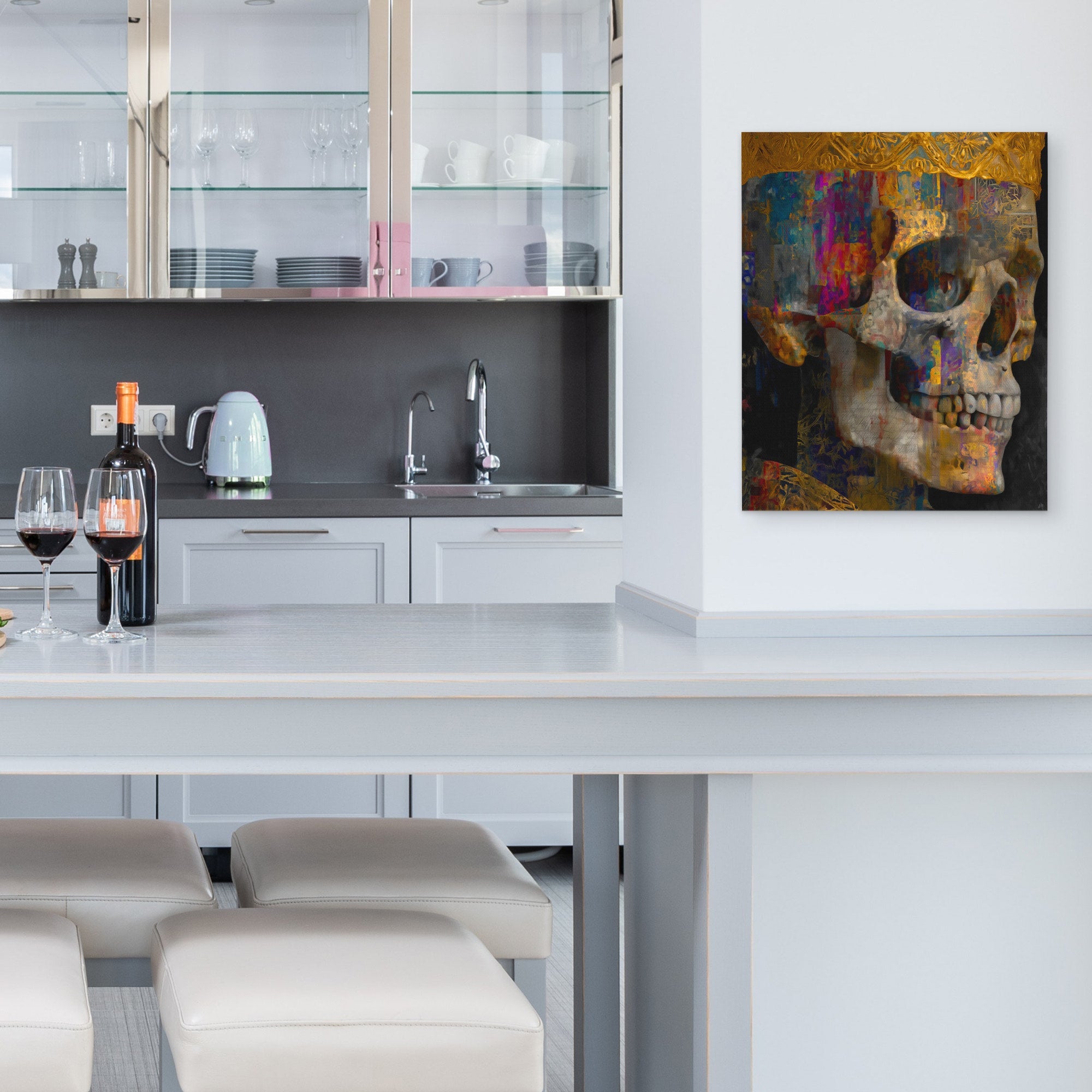 A crowned skull in golden fragments. Gothic grandeur with modern layers. Works in living rooms, bars, or spaces with dark elegance.