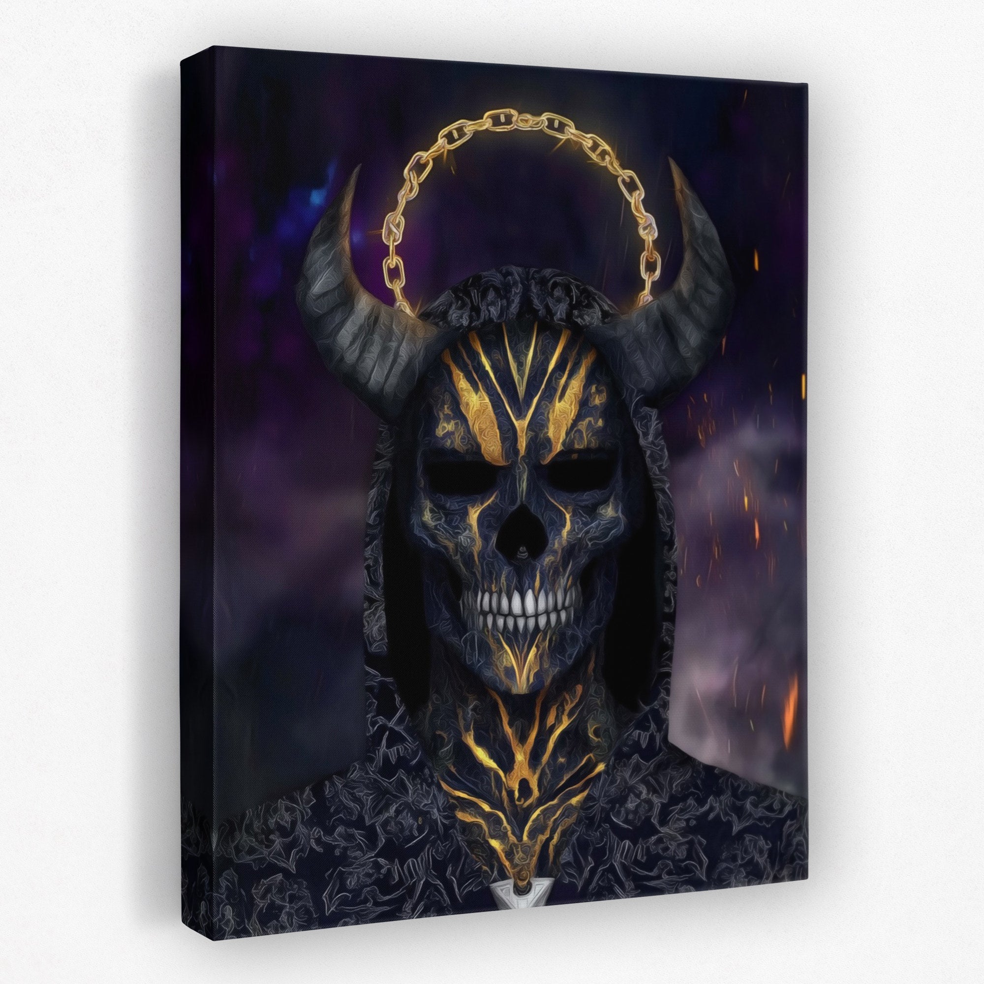 Gothic horned skull with golden patterns and chain halo. Perfect for a man cave or game room.