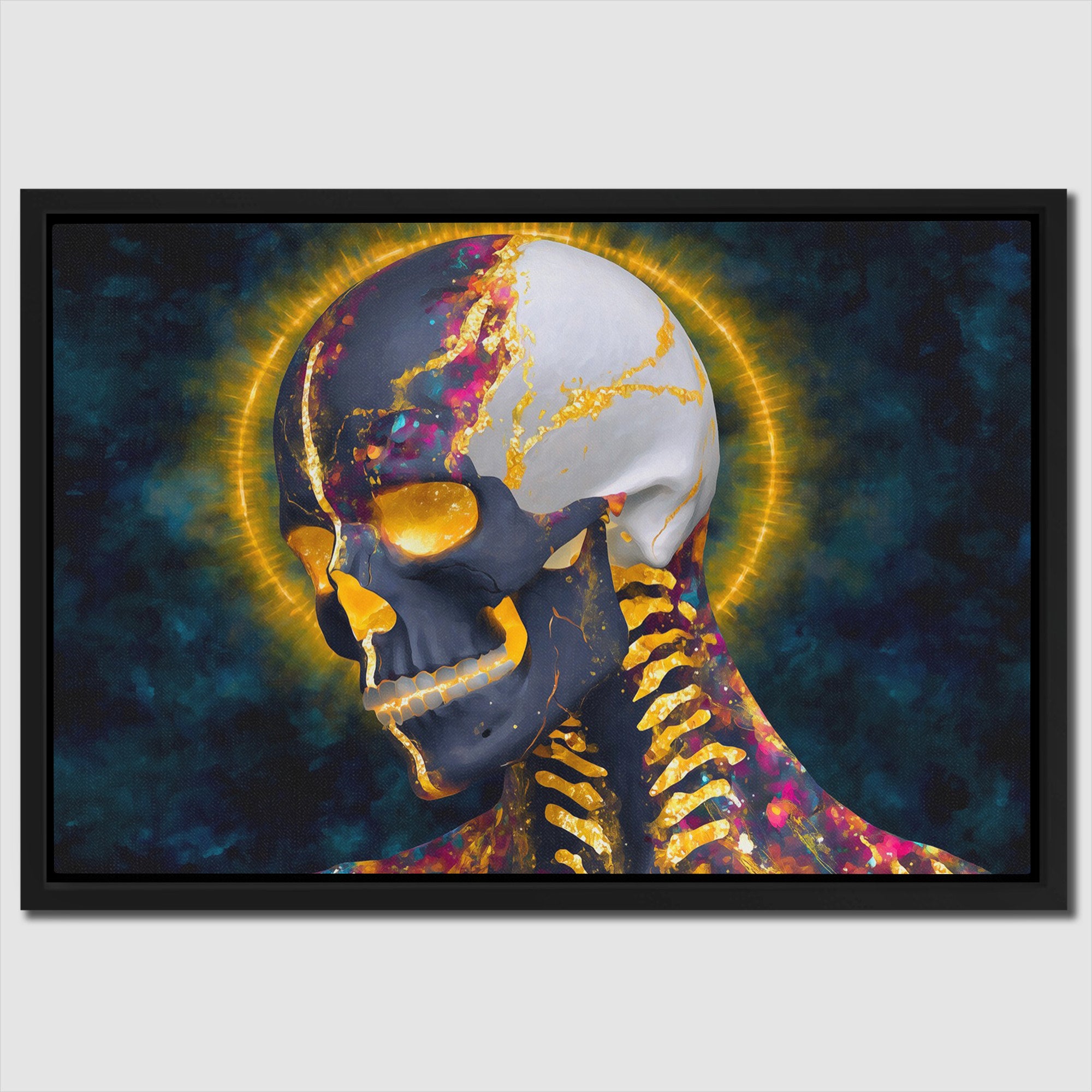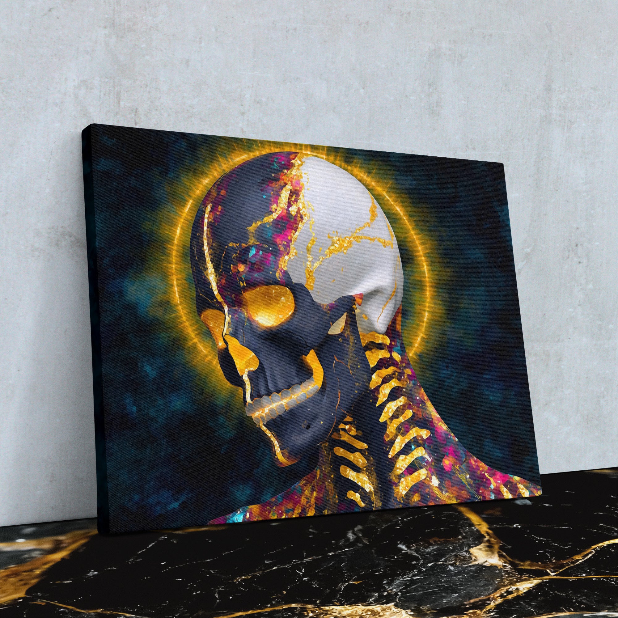 Skull with golden halo on cosmic purple. A transcendent piece for any lounge.