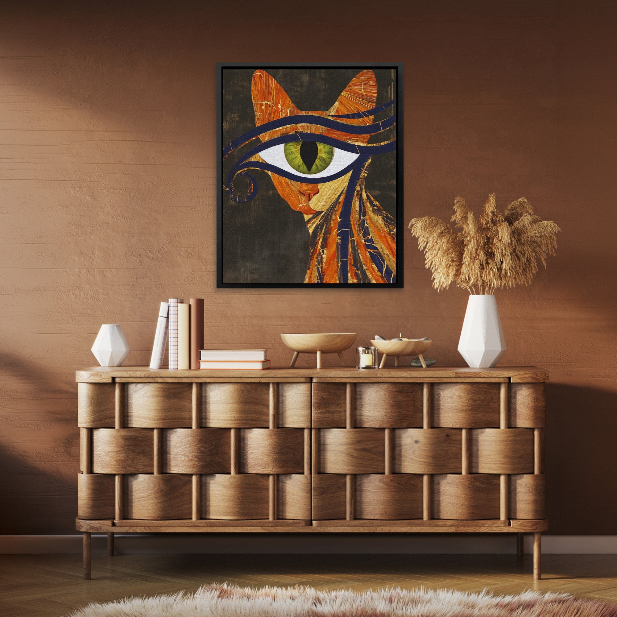 This digital artwork blends feline elegance with mystical symbolism, creating a piece that feels both ancient and contemporary. The rich color palette and fine detailing make it a conversation starter in any modern living space or creative studio.