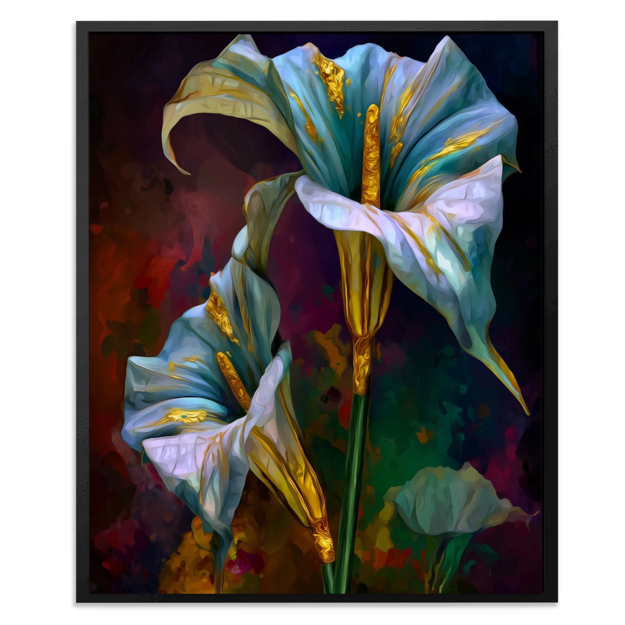 This piece lifts botanical art into something more theatrical. The lilies feel almost sculptural, their beauty intensified by the darkness around them.
