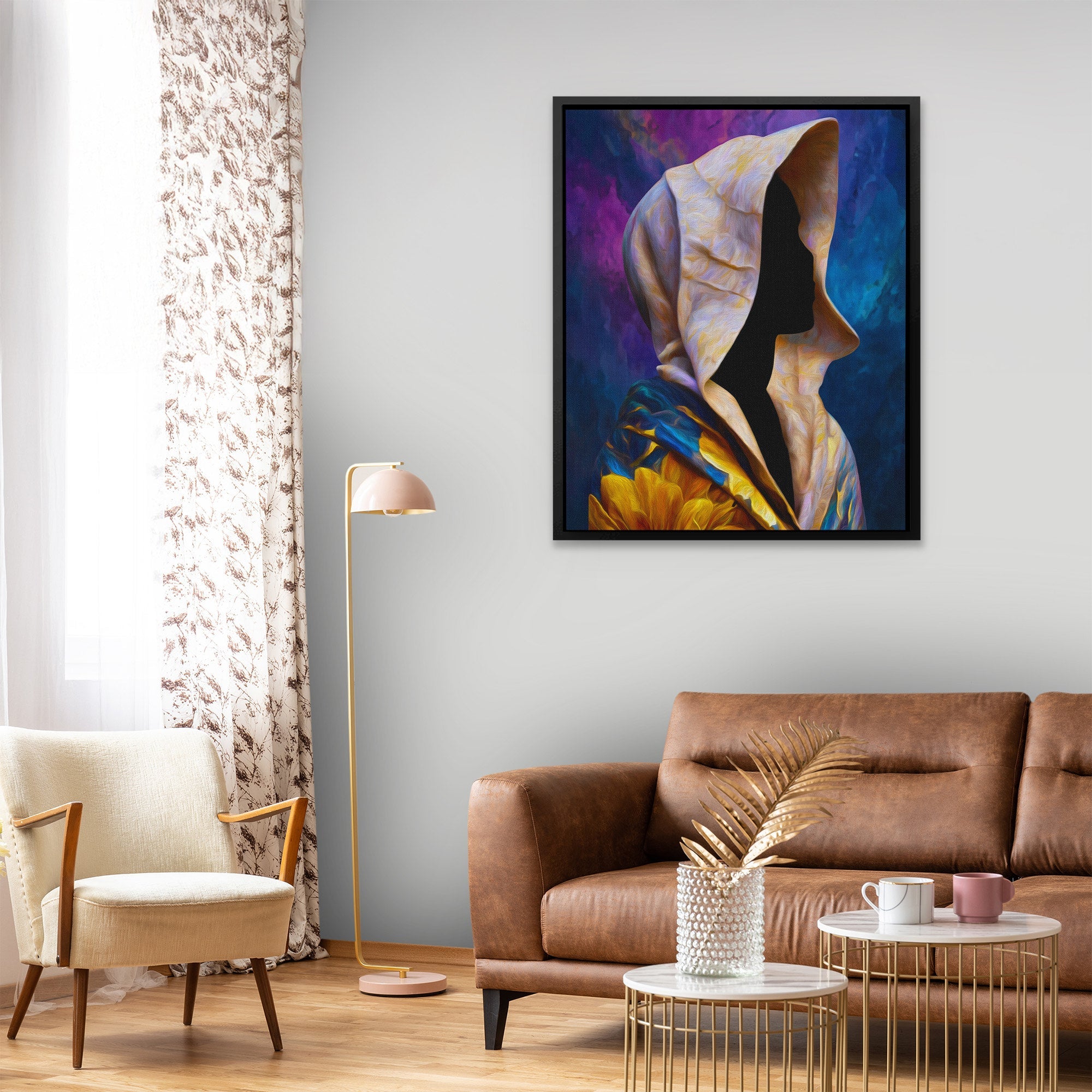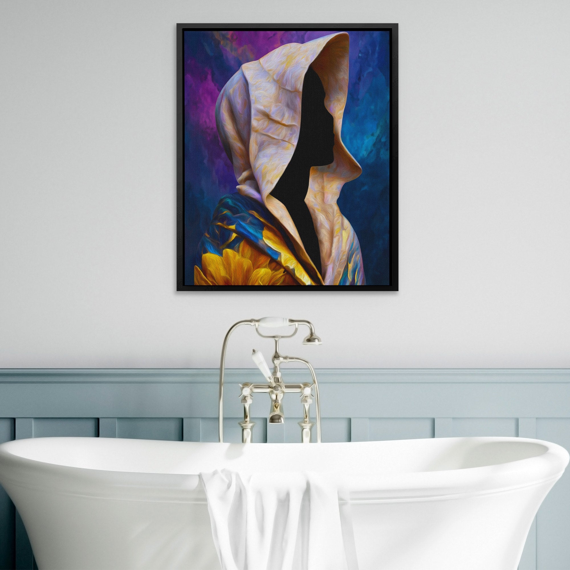 A hooded figure in dramatic light. Mysterious and striking. Works in bedrooms, offices, or spaces drawn to the enigmatic.